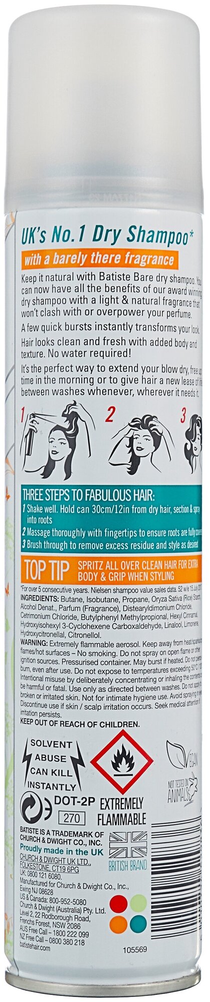 Batiste Bare - сухой шампунь для волос с цветочным ароматом, для быстрого придания свежести, объема и структурности. Его действие аналогично обычному шампуню, а аромат не впитывается в волосы и не перебивает запах любимых духов. Основные ноты - лимон, мандарин и огурец. Спрей подойдет для всех типов волос – натуральных, окрашенных, коротких или длинных, седых, осветленных, сухих, жирных, тонких или вьющихся, поврежденных и ослабленных.