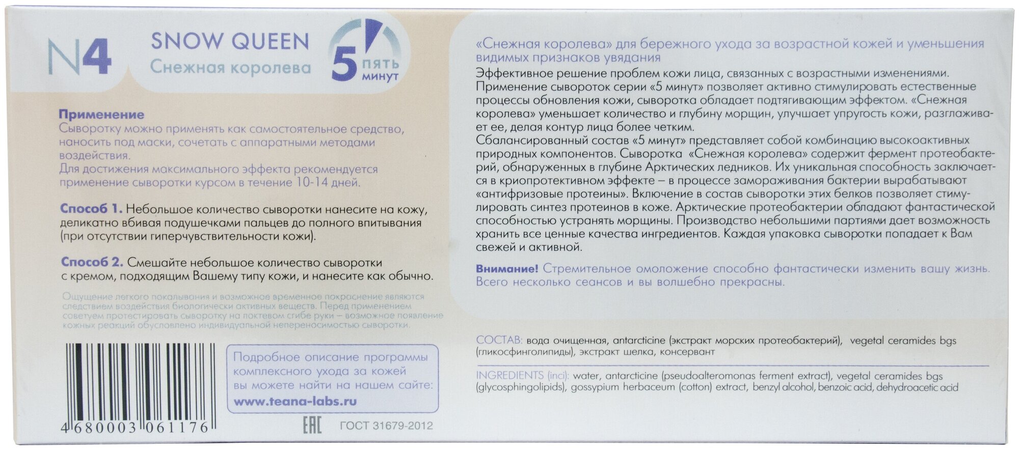 Уникальный состав серии «5 минут», разработанный лабораторией Teana с использованием новейших технологий, представляет собой комбинацию высокоактивных природных компонентов. Сыворотка «Снежная королева» содержит фермент протеобактерий, обнаруженных в глубине Антарктических ледников. Их уникальная особенность заключается в криопротективном эффекте - в процессе замораживания бактерии вырабатывают «антифризовые протеины». Включение в состав сыворотки этих белков позволяет стимулировать синтез протеинов в коже, ни один косметический ингредиент не действует так мощно. Арктические протеобактерии обладают фантастической способностью устранять морщины. Этот инновационный ингредиент творит настоящие чудеса.