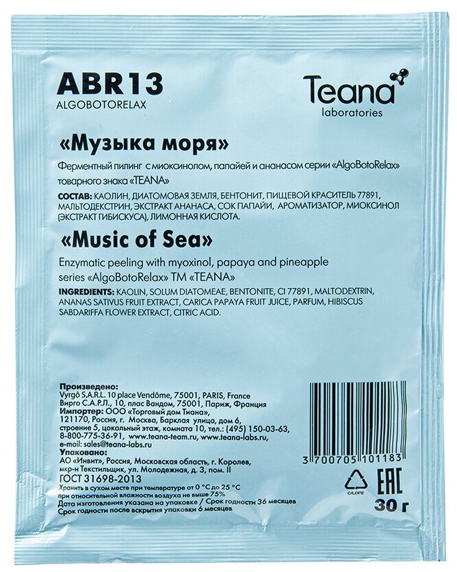 Teana Альгинатная Пилинг - маска для чувствительной кожи «Музыка моря» 30х5 гр (Teana ) (TEAABR13)