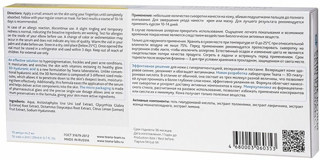 | Полное описание | Концентрат "Сияние кожи" Teana предназначен для бережного осветления кожи. Веснушки, пигментные пятна, появляющиеся с наступлением весны и так огорчающие многих, больше не будут досаждать вам. Сияние кожи не только эффективно осветляет кожу, но и защищает ее от вредного воздействия ультрафиолетовых лучей и препятствует появлению пигментации. Нежно воздействуя на глубокие слои кожи, смягчает ее, обогащает витамином С, наполняет жизненной силой, сиянием молодости и красоты. Состав: Вода очищенная, Экстракты толокнянки, Лакричника, Баи хиан пи, Ангелики, Баи жи, Лимона. Применение: Нанесите концентрат на предварительно очищенную кожу точечно или на все лицо и декольте. Оставьте концентрат до полного впитывания. Концентрат можно использовать самостоятельно, а также использовать под (или вводить в ) кремы или маски "Пятое чувство" или "Сокровища Арганы" (для использования ампул мы специально РЕКОМЕНДУЕМ два БАЗОВЫХ крема из серии "Сокровища Арганы" - "Горный лед" - для любой кожи - "Жемчужное ожерелье" - для зрелой кожи). Использовать концентрат в первую неделю ежедневно, затем курсами 2-3 раза в неделю. |