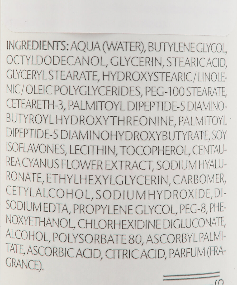 Состав: aqua (water), butylene glycol, octyldodecanol, glycerin, stearic acid, glyceryl stearate, hydroxystearic / linolenic / oleic polyglycerides, peg-100 stearate, ceteareth-3, palmitoyl dipeptide-5 diaminobutyroyl hydroxythreonine, palmitoyl dipeptide-5 diaminohydroxybutyrate, soy isoflavones, lecithin, tocopherol, centaurea cyanus flower extract, sodium hyaluronate, ethylhexylglycerin, carbomer, cetyl alcohol, sodium hydroxide, disodium edta, propylene glycol, peg-8, phenoxyethanol, chlorhexidine digluconate, alcohol, polysorbate 80, ascorbyl palmitate, ascorbic acid, citric acid, parfum (fragrance).