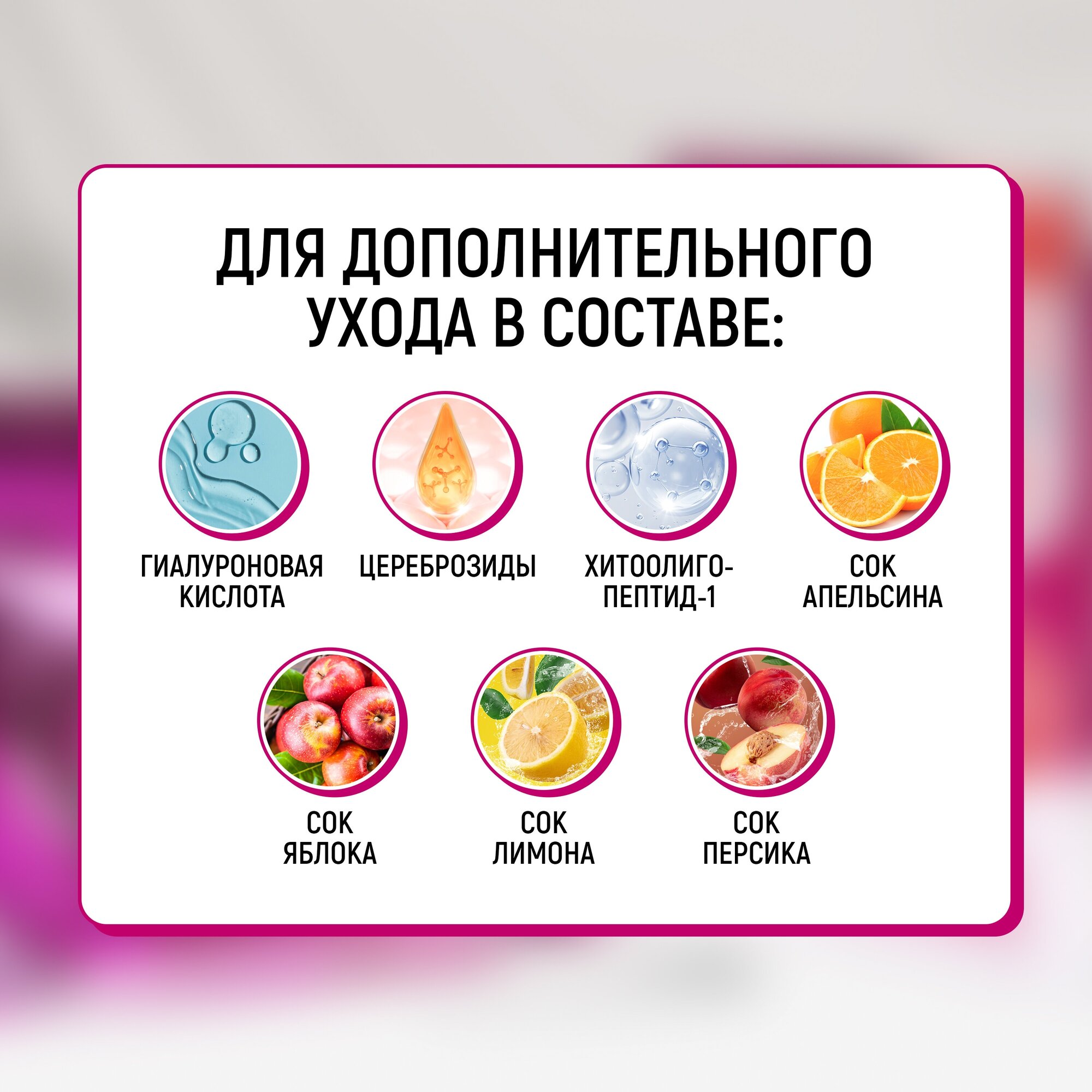 | Состав | вода, bg, глицерин, растворенный коллаген, гидролизный коллаген, экстракт плаценты, гиалуроновая кислота na, цереброзид, хитоолигопептид-1, сок апельсина, сок яблока, сок лимона, сок персика, фосфат натрия, лецитин, соевое масло, гидроксиэтилцеллюлоза, пальмовое масло, алкил, pg, димониум хлорид фосфат, лимонная кислота, ароматизаторы |