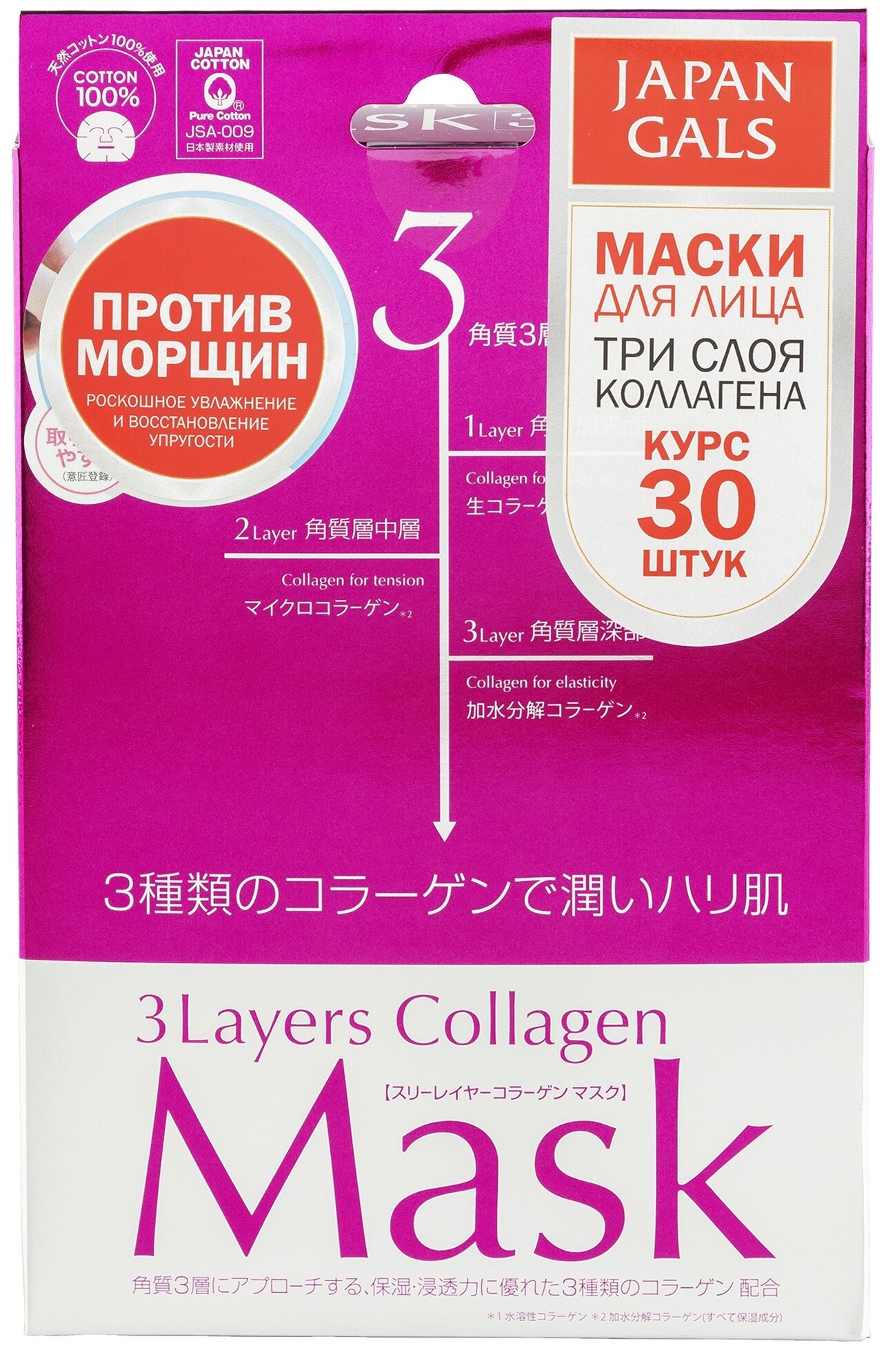 Japan Gals Japan Gals Маска 3 Слоя Коллагена 30 шт (Japan Gals ) с 3-мя видами коллагена