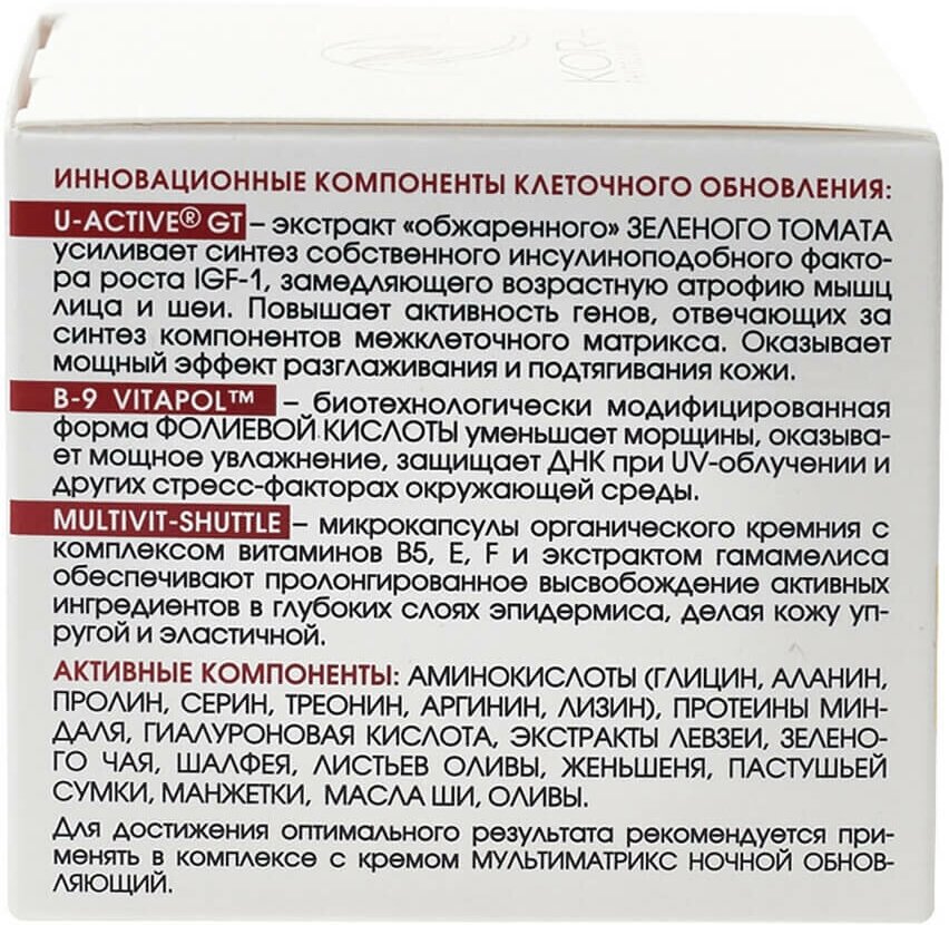 | Применение | крем предназначен для использования после тридцати лет. Его наносят маленькими порциями на предварительно очищенную кожу и помогают средству впитаться, совершая легкие вбивающие движения подушечками пальцев. Рекомендуется применять в комплексе с ночным кремом мультиматрикс |