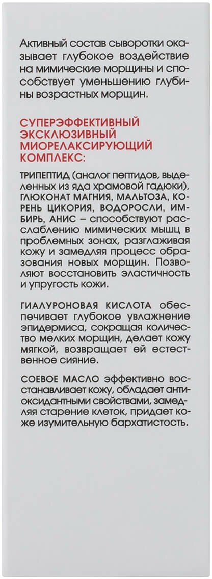 | Применение | нанести утром под Крем для разглаживания мимических и возрастных морщин и вечером под Крем с эффектом ботокса для восстановления упругости кожи. |
