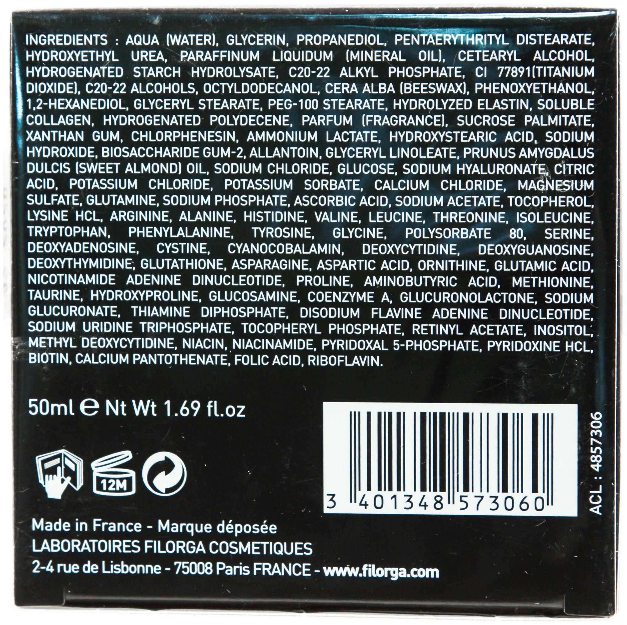Состав: aqua (water, eau), glycerin, propanediol, pentaerythrityl distearate, hydroxyethyl urea, paraffinum liquidum (mineral oil), cetearyl alcohol, sorbitol, c20-22 alkyl phosphate, ci 77891 (titanium dioxide), c20-22 alcohols, octyldodecanol, cera alba (beeswax, cire d’abeille), phenoxyethanol, 1,2-hexanediol, glyceryl stearate, peg-100 stearate, hydrolyzed elastin, soluble collagen, hydrogenated polydecene, parfum (fragrance), sucrose palmitate, xanthan gum, chlorphenesin, sodium hydroxide, hydroxystearic acid, biosaccharide gum-2, allantoin, glyceryl linoleate, alumina, prunus amygdalus dulcis (sweet almond) oil, sodium chloride, glucose, sodium hyaluronate, citric acid, potassium chloride, potassium sorbate, calcium chloride, magnesium sulfate, glutamine, sodium phosphate, ascorbic acid, sodium acetate, tocopherol, lysine hcl, arginine hcl, alanine, histidine hcl, valine, leucine, threonine, isoleucine, tryptophan, phenylalanine, tyrosine, glycine, polysorbate 80, serine, cystine, cyanocobalamin, glutathione, asparagine, aspartic acid, ornithine hcl, glutamic acid, nicotinamide adenine dinucleotide, proline, methionine, taurine, hydroxyproline, glucosamine hcl, coenzyme a, sodium glucuronate, thiamine diphosphate, retinyl acetate, inositol, niacin, niacinamide, pyridoxine hcl, biotin, calcium pantothenate, riboflavin, sodium tocopheryl phosphate, thiamine hcl, folic acid