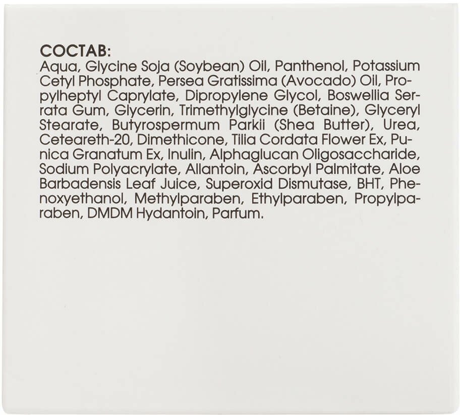 | Состав | aqua; glycine soja (soybean) oil; panthenol; potassium cetyl phosphate; persea gratissima (avocado) oil; propylheptyl caprylate; dipropylene glycol; boswellia serrata gum; glycerin; trimethylglycine (betaine); glyceryl stearate; butyrospermum parkii (shea butter); urea; ceteareth-20; dimethicone; tilia cordata flower ex; punica granatum ex; inulin; alphaglucan oligosaccharide; sodium polyacrylate; allantoin; ascorbyl palmitate; aloe barbadensis leaf juice; superoxid dismutase; bht; phenoxyethanol; methylparaben; ethylparaben; propylparaben; вьвь hydantoin; parfum |