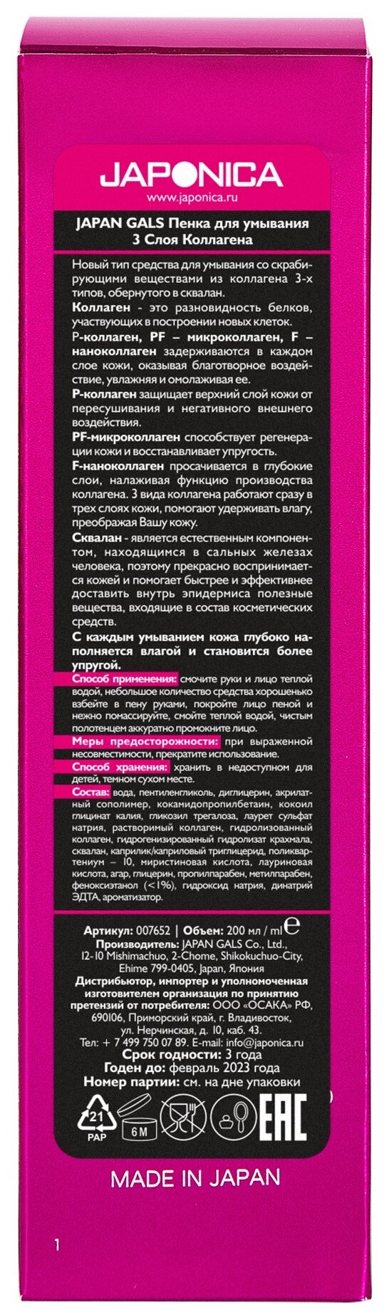 | Полное описание | Japan Gals 3Layers Collagen Foam - новый тип средства для умывания со скрабирующими веществами из коллагена 3-х типов, обернутого в Новый тип средства для умывания со скрабирующими веществами из коллагена 3-х типов, обернутого в сквалан. Коллаген - это разновидность белков, участвующих в построении новых клеток. Р-коллаген, PF микро-коллаген, F нано-коллаген задерживаются в каждом слое кожи, оказывая благотворное воздействие, увлажняя и омолаживая ее. Р-коллаген защищает верхний слой кожи от пересушивания и негативного внешнего воздействия. PF-микро-коллаген способствует регенерации кожи и восстанавливает упругость. И, наконец, F-нано-коллаген просачивается в глубокие слои, налаживая функцию производства коллагена. 3 вида коллагена работают сразу в трех слоях кожи, помогают удерживать влагу, преображая вашу кожу! Сквалан - является естественным компонентом, находящимся в сальных железах человека, поэтому прекрасно воспринимается кожей и помогает быстрее и эффективнее доставить внутрь эпидермиса полезные вещества, входящие в состав косметических средств. С каждым умыванием кожа глубоко наполняется влагой и становится более упругой! Способ применения: смочите руки и лицо теплой водой, небольшое количество средства хорошенько взбейте в пену руками, покройте лицо пеной и нежно помассируйте, смойте теплой водой, чистым полотенцем аккуратно промокните лицо. Предупреждение: при выраженной несовместимости, прекратите использование. Объем |