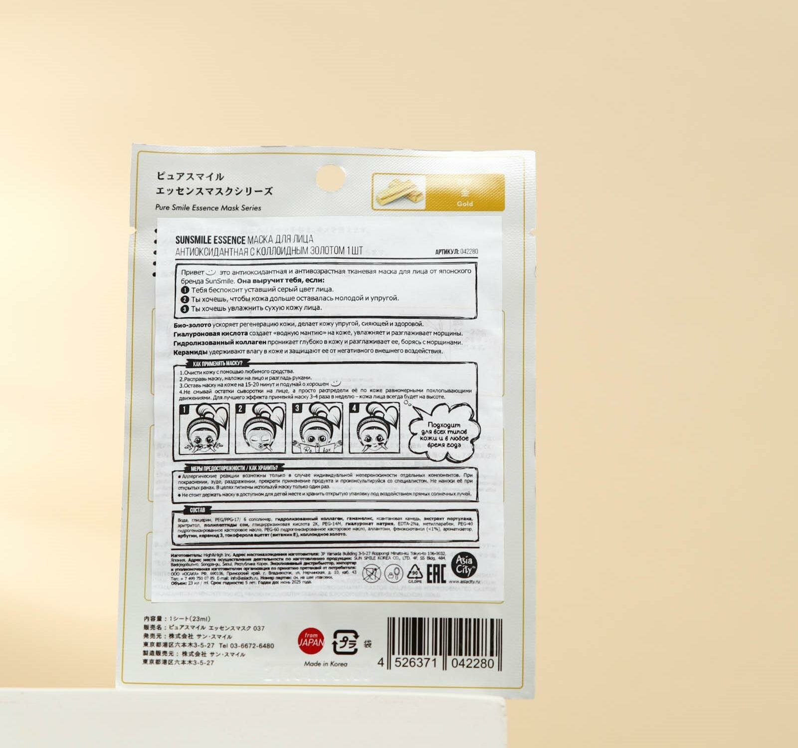 Это антиоксидантная и антивозрастная тканевая маска для лица от японского бренда SunSmile. Она выручит тебя, если: 1. Тебя беспокоит уставший серый цвет лица. 2. Ты хочешь, чтобы кожа дольше оставалась молодой и упругой. 3. Ты хочешь увлажнить сухую кожу лица. Маска содержит множество полезных ингредиентов для заботы о коже: • Био-золото ускоряет регенерацию кожи, делает кожу упругой, сияющей и здоровой. • Гиалуроновая кислота создает «водную мантию» на коже, увлажняет и разглаживает морщины. • Гидролизованный коллаген проникает глубоко в кожу и разглаживает ее, борясь с морщинами. • Керамиды удерживают влагу в коже и защищают ее от негативного внешнего воздействия. Рекомендуем: для всех типов кожи и в любое время года.