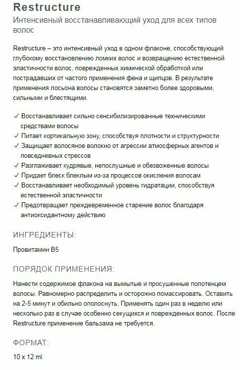Интенсивный лосьон способствует восстановлению структуры сухих и поврежденных волос. Может использоваться в качестве подготовки к дальнейшему окрашиванию и тонированию, гарантируя равномерный результат. Волосы мгновенно пробуждаются, становятся блестящими и насыщаются жизненной энергией.