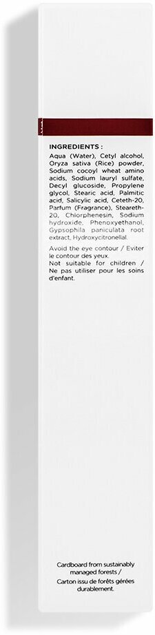 - Микрогранулы риса обеспечивают деликатное абразивное воздействие на кожу, усиливая кератолитическое действие салициловой кислоты, стимулируют микроциркуляцию и насыщение клеток кислородом.