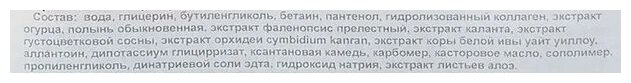 | Химический состав | вода, глицерин, бутиленгликоль, бетаин, пантенол, коллаген гидролизованный, огуречный экстракт, экстракт полыни обыкновенной, экстракт фаленопсиса прелестного, экстракт каланта, экстракт сосны густоцветковой, экстракт орхидеи cymbidium kanran, экстракт коры белой ивы, аллантоин, дипотассиум глицирризат, камедь ксантановая, карбомер, масло касторовое, сополимер, пропиленгликоль, динатриевой соли ЭДТА, натрия гидроксид, экстракт листьев алоэ |