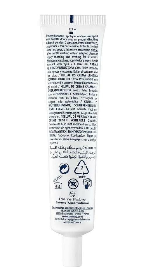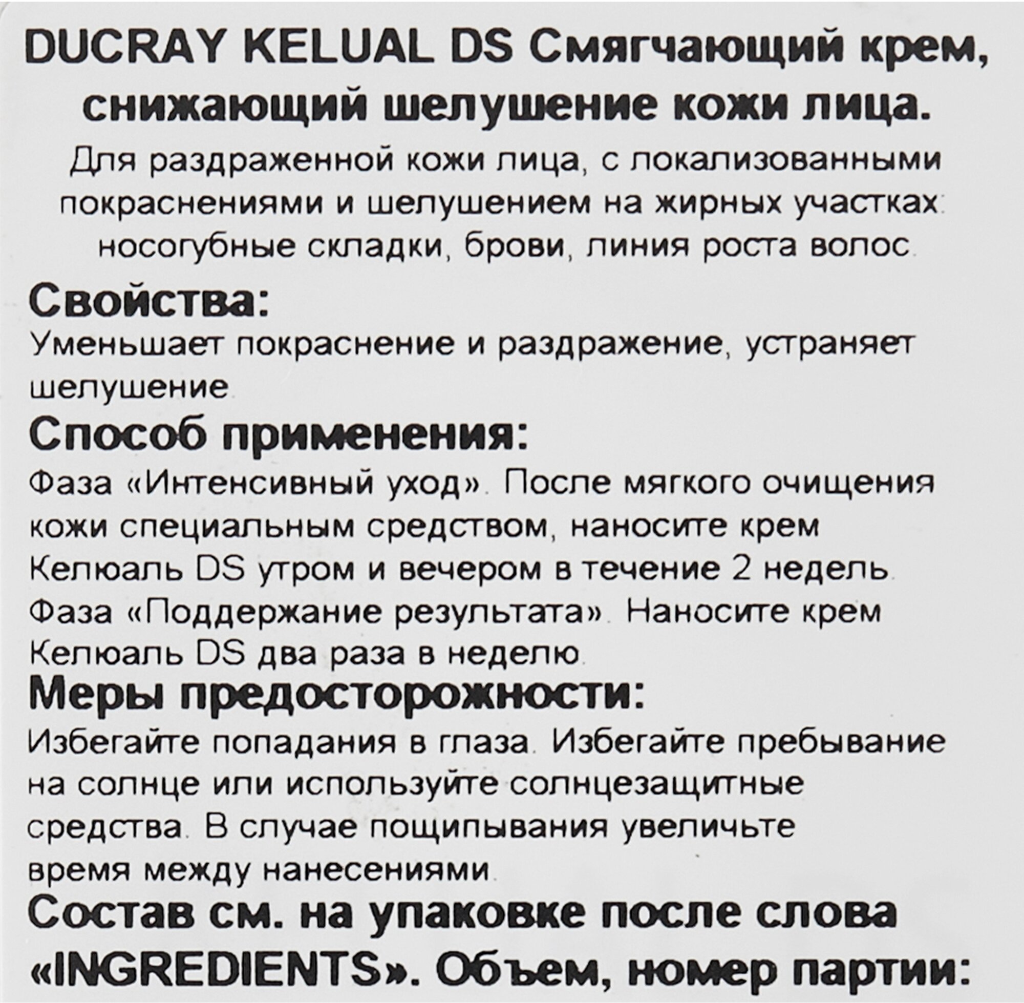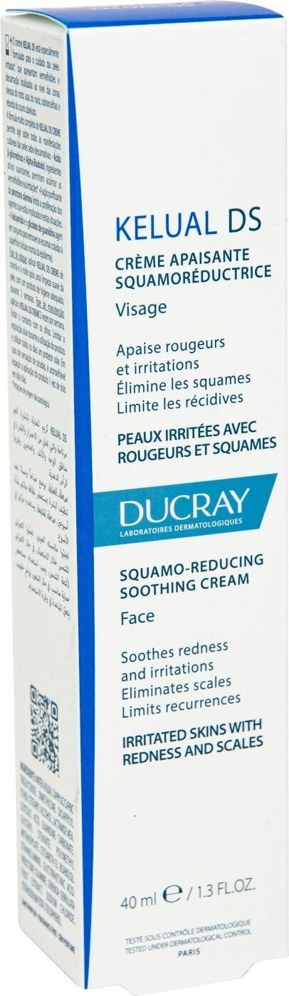 | Полное описание | Ducray Kelual DS cream - Крем-кераторедуктор для устранения шелушения, 40 мл Этот крем создан специально для устранения шелушения, зуда и покраснения и особых зон, подверженных умеренной и тяжелой формам себореи, таких как: кожа головы, брови, носогубные складки, зона за ушами, область век По результатам применения Келюаль DS*: на 80% снятие раздражений на 100% устранение чешуек перхоти на 100% улучшение в завершении курса поддерживающего применения. Способ применения |