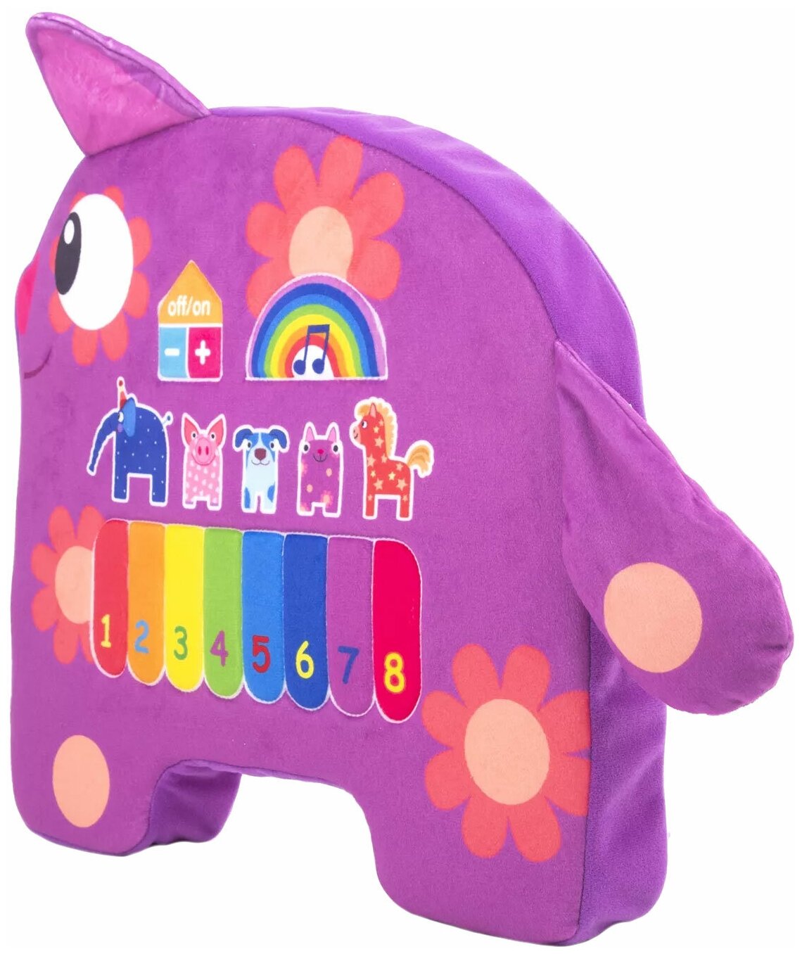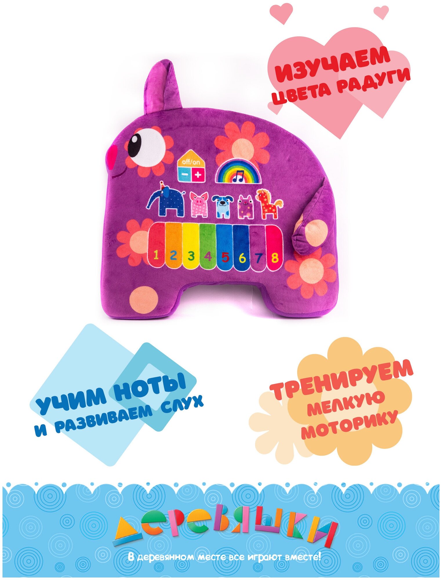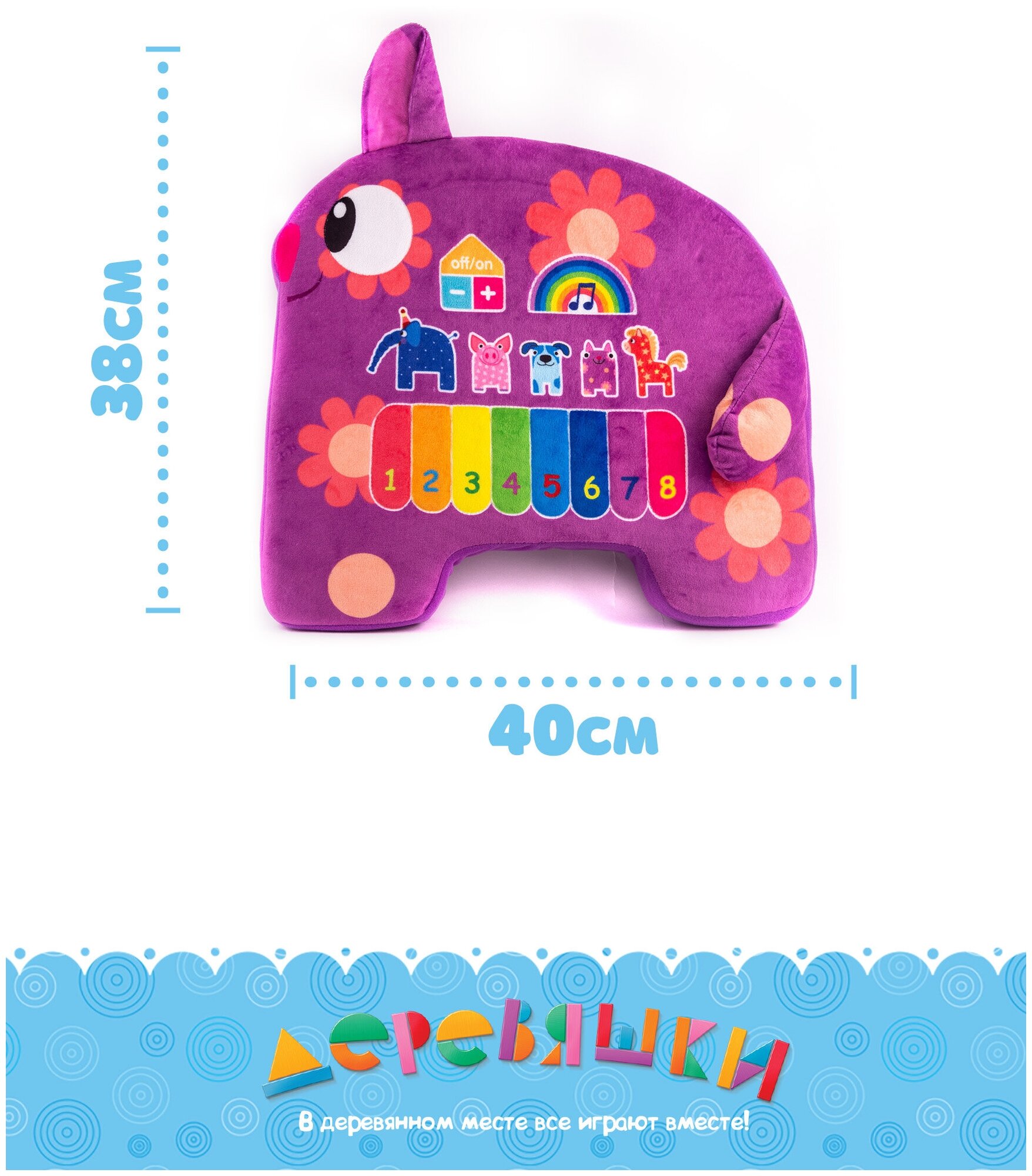 Деревяшки Игрушка музыкальная Кошечка Мяу С этой игрушкой можно и пошуршать, и повеселиться, ведь компанию вам составит известная героиня детского мультсериала Деревяшки Кошечка Мяу. Она также напомнит малышу и про других персонажей телевизионной картины, а также познакомит кроху с пианино. Музыкальная игрушка для детей от 1 года. Особенности: Игрушка выполнена в виде мультипликационного персонажа – Кошечки Мяу из мультсериала Деревяшки. Игрушка имеет плоскую форму, а ее расцветка соответствует экранному образу персонажа. Кошечка оснащена звуковым модулем, она проигрывает мелодию из мультсериала, воспроизводит 5 голосов героев, а также обладает встроенным пианино. Текстильная клавиатура включает в себя 8 клавиш разных цветов, каждая из которых соответствует определенной ноте. Игрушка сшита из гипоаллергенных тканей приятных и мягких наощупь, а в качестве ее наполнителя используется синтепон. Также у нее имеется шуршалка, представляющая собой ушко кошки. У игрушки присутствует регулятор громкости и кнопка включения С такой кошечкой ребенок пополнит свою коллекцию мультгероев, а также обзаведется новым интерактивным другом. Питание: 3 пальчиковые батарейки типа АА Игрушка мягконабивная, изображающая животных, с верхом из текстильного материала - полиэстер, с наполнителем из полиэфирных волокон, работающие от химических источников тока, со звуковыми эффектами.