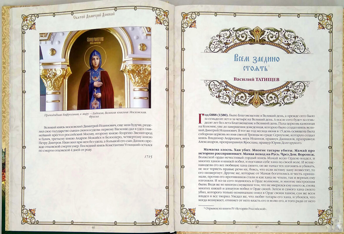 Великий князь Димитрий Иванович Донской был удостоен общецерковного почитания в 1988 году на Поместном Соборе Русской Православной Церкви. В 2020 году Россия отметит две знаменательные даты - 670-летие со дня рождения святого благоверного великого князя Димитрия Донского и 640-летие со дня победы в Куликовской битве. К этим славным датам приурочен выход данного издания, куда вошли "Слово о житии и преставлении князя Дмитрия Ивановича", созданное на рубеже ХI-Х веков, первый стихотворный перевод древнерусской песни "Задонщина" XIV века, исторические исследования русских талантливых авторов ХІІ-ХХ столетий А. И. Манкиева, В. Н. Татищева, А. В. Казадаева, Н. В. Савельева-Ростиславича, Н. И. Троицкого и архимандрита Леонида (Кавелина). Книгу украсили стихотворения поэтов XIX века Н. М. Языкова, Л. А, Якубовича, Л. Н. Трефолева и Д. Б. Кедрина, В. А. Озерова. Завершает сборник драматическая поэма современного петербургского поэта Е. В. Лукина "Непобедимая воевода", в основу которой легла легенда о Донской иконе Богородицы, обретенной во время Куликовской битвы.