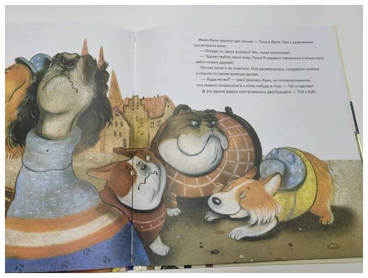 В книжке описано, как собачье семейство породы корги переехало на новое место, и их маленькая дочка забавная Куки пытается подружиться с другими обитателями двора, но получается у нее это не сразу. Книгу мы читали втроем, я и двое внучек (3,5 и 4 года), им понравилось. Старшая сказала, что когда она перешла в новый садик, с ней тоже сначала никто не хотел делиться игрушками, но потом она подружилась с ребятами. Так что история с собачкой «жизненная» получилась. В конце размещены вопросы, чтобы побеседовать с детьми, обсудить прочитанное. Немного про саму книгу: текста не очень много, т.е. неутомительно для детей, зато много больших красочных картинок.