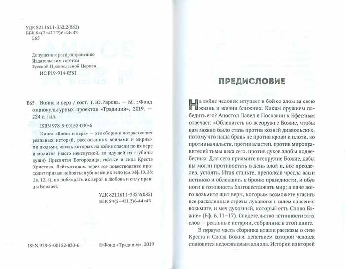 Книга "Война и вера" состоит из рассказанных очевидцами реальных и жизненных событий.Которые к сожалению не опишут не в одном учебнике истории.Каждая история читается легко.. Ранее видела православный журнал "Альмонах", часть историй , вошедших в книгу "Война и вера" было опубликовано в вышеупомянутом журнале, который был выпущен однократно.Мечтала найти хотя бы часть этих историй из Альмнаха и вот мечта осуществилась .Очень простым доступным языком описаны события, ,детям , начиная с 12 лет можно смело давать читать.Картинок цветных нет ,да их особо и не прикрепишь к жизненным событиям. Побольше бы таких книг .Вот такие истории ,которые рассказывают реальные люди описывают настоящее человеческое состояние людей в условиях войны и боевых действий.раскрывая другую реальную сторону, а не сухую историческую статистику .