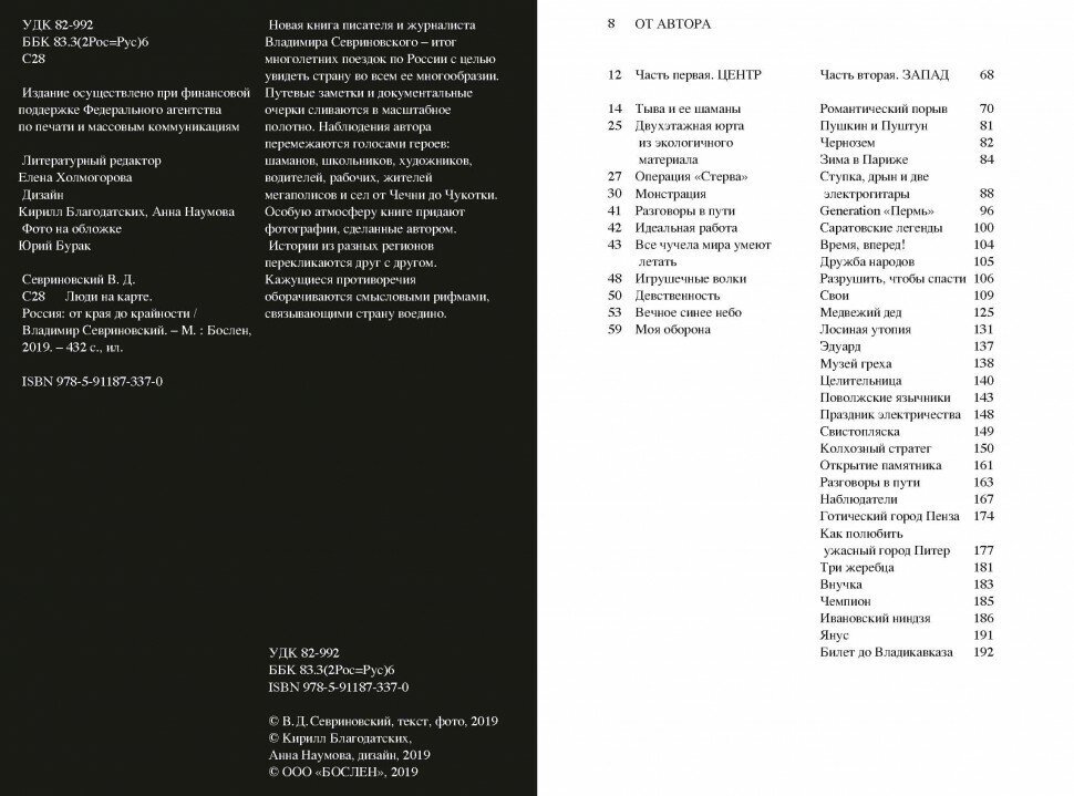 Книга писателя и журналиста Владимира Севриновского - итог многолетних поездок по России с целью увидеть страну во всем ее многообразии. Путевые заметки и документальные очерки сливаются в масштабное полотно. Наблюдения автора перемежаются голосами героев: шаманов, школьников, художников, водителей, рабочих, жителей мегаполисов и сел от Чечни до Чукотки. Особую атмосферу книге придают фотографии, сделанные автором. Истории из разных регионов перекликаются друг с другом. Кажущиеся противоречия оборачиваются смысловыми рифмами, связывающими страну воедино.