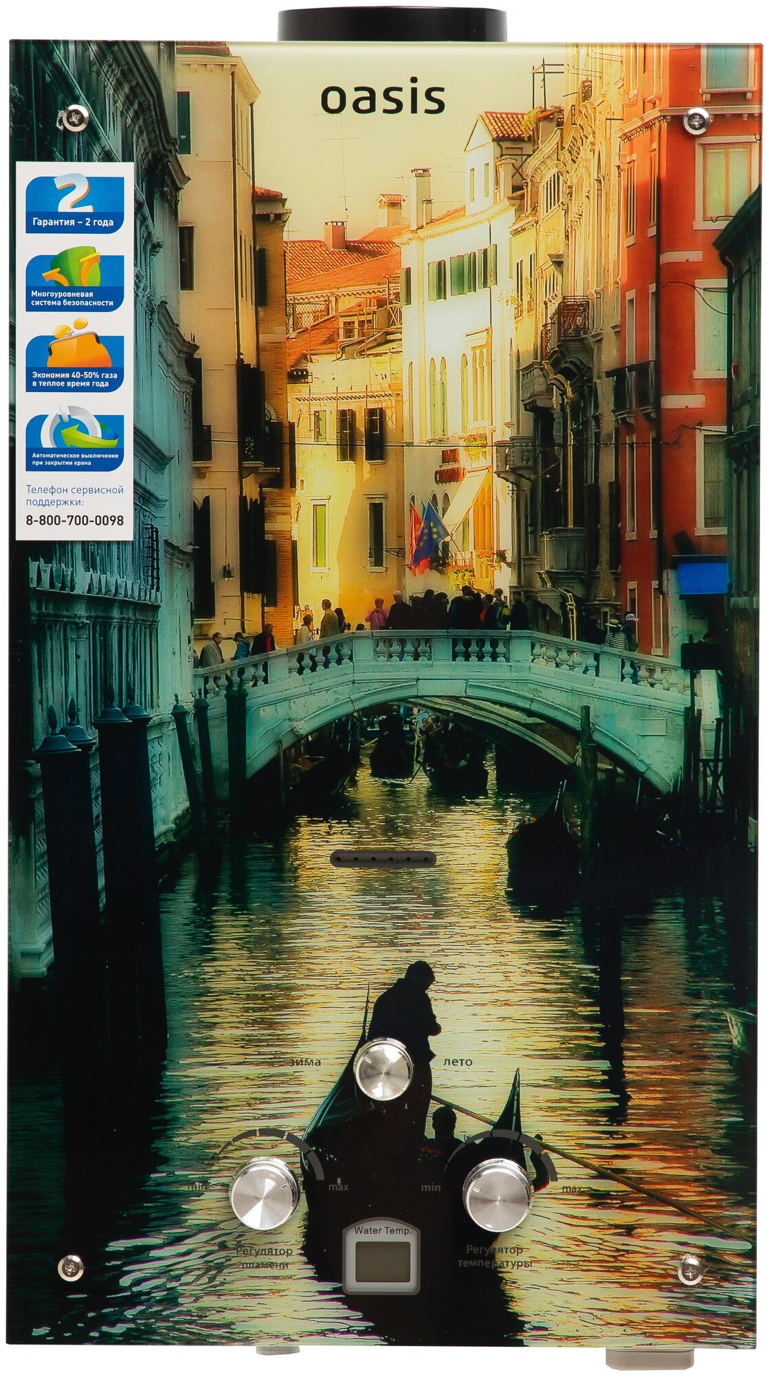 | Прочие особенности и свойства | Oasis Glass TG20 - стильный газовый проточный водонагреватель для горячего водоснабжения. Принцип его работы достаточно прост:вода проходит через теплообменник прибора и моментально нагревается от сгорающего газа, поступая к потребителю уже горячей. Oasis подходит для любых квартир и частных домов, оборудованных дымоходом. Автоматический розжиг от батареек помогает избавиться от неудобств при неожиданном отключении электричества. Работа прибора осуществляется на природном газе. Отсутствие постоянно горящего запальника и специальный переключатель "Зима-лето" позволяют экономить около 70 кубических метров газа в год.,Отличительной особенностью данной модели является стеклянная поверхность и рисунок "Венеция". |