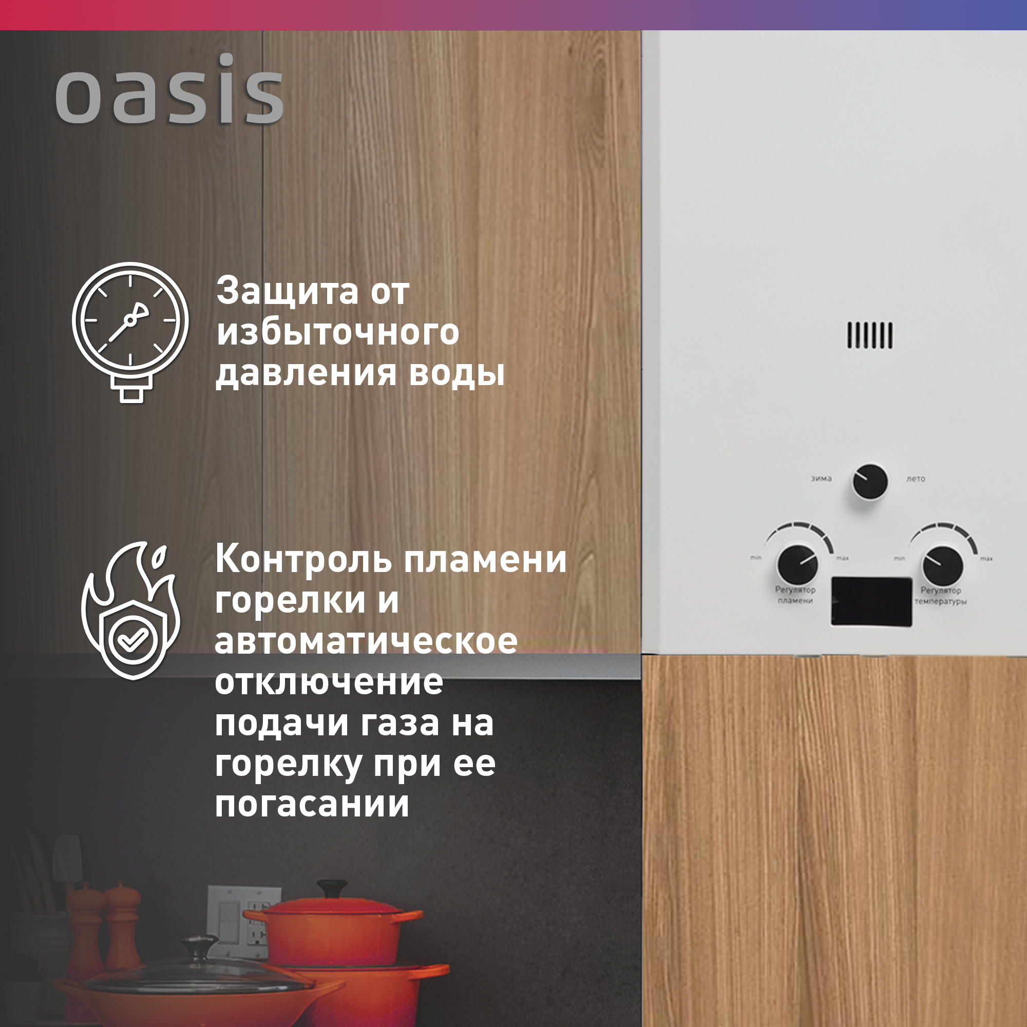 Газовый проточный водонагреватель «Oasis» служит для горячего водоснабжения. Принцип его работы достаточно прост: вода проходит через теплообменник прибора и моментально нагревается от сгорающего газа, поступая к потребителю уже горячей. «Oasis» подходит для любых квартир и частных домов, оборудованных дымоходом. Автоматический розжиг от батареек помогает избавиться от неудобств при неожиданном отключении электричества. Работа прибора осуществляется на природном газе. Отсутствие постоянно горящего запальника и специальный переключатель «Зима-лето» позволяют сократить расходы на газ.