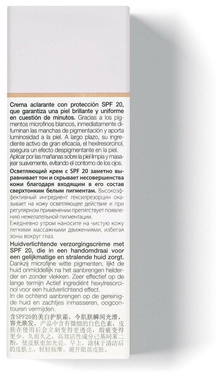 Осветляющий крем выравнивает тон и скрывает несовершенства кожи благодаря входящим в него сверхтонким белым пигментам. Наличие SPF защиты выгодно отличает средство от его аналогов. Вместе с тем богатый растительный состав интенсивно увлажняет кожу и обеспечивает оптимальный уход в течение дня. При регулярном использовании (на протяжении 8 недель) достигается осветляющий эффект.