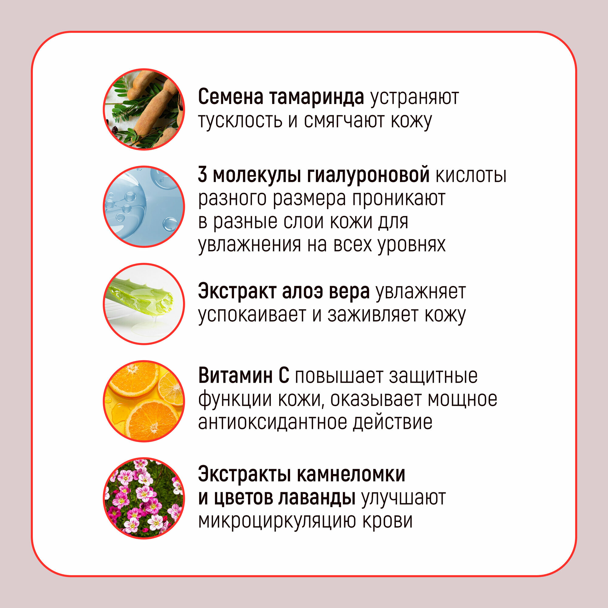 Основные активные компоненты: Семена тамаринда содержат флавоноиды, витамины групп А,С,В, микроэлементы и аминокислоты, АНА-кислоты. Увлажняют и питают, защищают от агрессивных факторов внешней среды, борются с тусклостью, отшелушивают ороговевшие клетки и смягчают кожу.