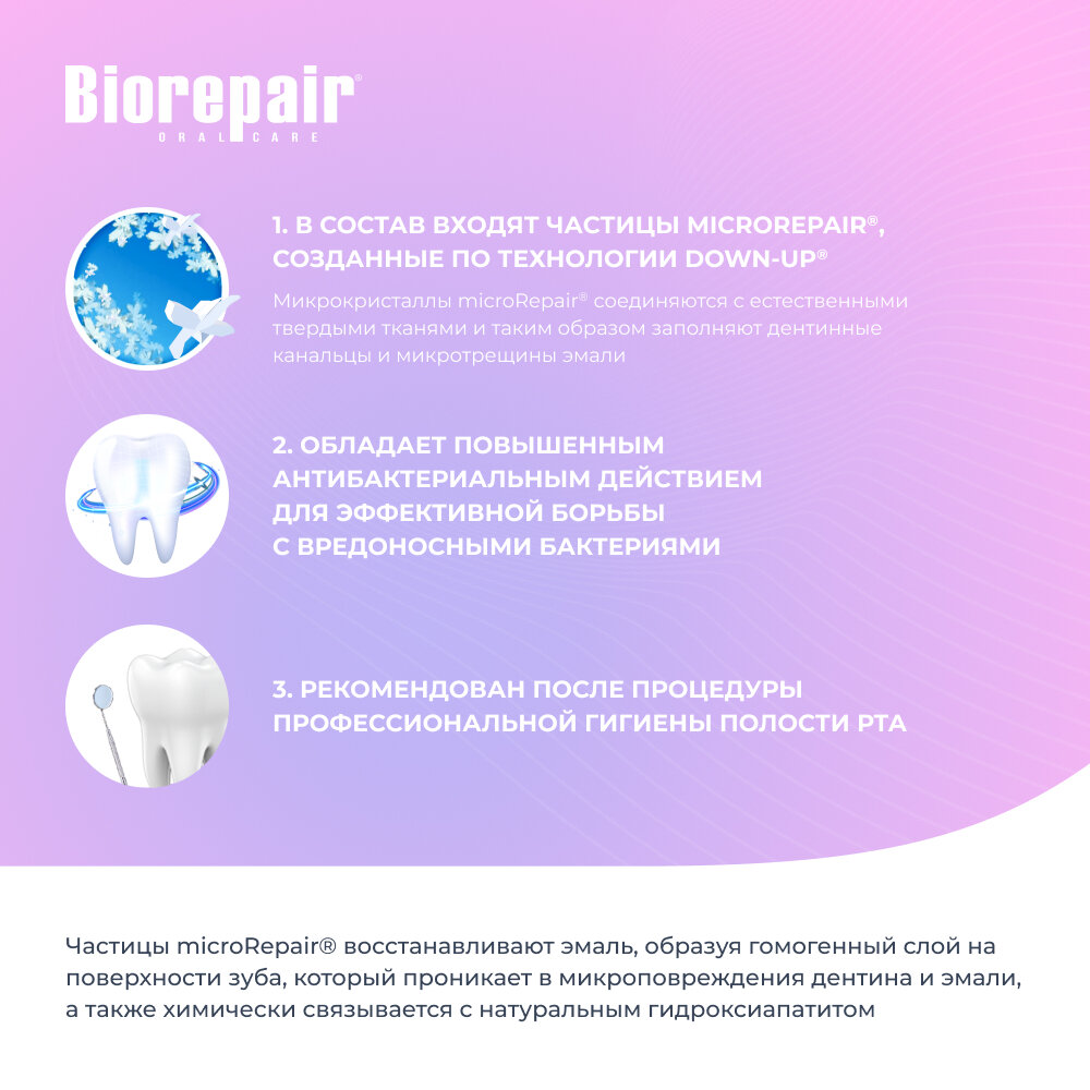 | Полное описание | Biorepair Антибактериальный ополаскиватель для ухода за деснами идеальное дополнение для основного ухода за полостью рта. Ополаскиватель имеет средне густую консистенцию, которая обволакивает зубы, проникая в труднодоступные места, такие как межзубные промежутки и придесневую зону. В таких местах щетка не способна достаточно хорошо очищать участки от налета, и как следствие, в этих зонах чаще всего образовывается кариес и/или зубные камни. Соответственно ополаскиватель это важная составляющая для качественного ухода за вашей полостью рта.Как работает Biorepair Антибактериальный ополаскиватель для ухода за деснами?1. Содержит вещества, которые дополнительно ухаживают за деснами, поддерживая их тонус и здоровье.Zn(PCA)* - антибактериальное и ранозаживляющее действиеГиалуроновая кислота - увлажнение и питаниеКалендула - противовоспалительное и кровоостанавливающее действие, снимает раздражение и смягчает слизистые тканиГамамелиса - вяжущее и антиоксидантное действие, снимает раздражениеСпирулина - антиоксидантное, противовоспалительное и тонизирующее действиеРетинол (витамин А) - антиоксидантное действиеТокоферол ( витамин Е) - антиоксидантное действие*Zn(PCA) - цинковая соль пирролидон-карбоновой кислоты.2. Интенсивная антибактериальная защита: тройная сила.Ополаскиватель Biorepair содержит частицы microRepair, в состав которых входят ионы цинка (Zn). Частицы microRepair закрепляются на эмали, благодаря своей игольчатой форме (идентичная форма натурального гидроксиапатита эмали) и остаются на поверхности в течение 24 часов. Когда уровень pH в полости рта снижается (например, после приема пищи) кристаллы microRepair распадаются на кальций, фосфаты и цинк.Кальций и фосфаты вступают в реакцию и восстанавливают эмаль зубов, ионы цинка освобождаются и воздействуют на бактериальную среду, подавляя ее размножение, тем самым не давая образовываться налету. Таким образом, восстанавливается уровень кислотности pH, зубы защищены от бактерий и кариеса, сохраняя свежесть дыхания.В состав входит вещество Zn(PCA), который подавляет рост и активность бактерий, являющихся основной причиной развития зубного налета и, как следствие, кариеса.В ополаскивателе также содержится ксилитол, который противостоит бактериям Streptococcus Mutants, активность которых приводит к деминерализации и разрушению эмали.Продукты Biorepair не содержат хлоргексидин, спирт и его производные и не вызывают раздражение слизистой оболочки полости рта.3. Восстановление эмали зубов.Biorepair содержит частицы microRepair - активные биомиметические** микрочастицы гидроксиапатита, идентичные натуральному гидроксиапатиту эмали и дентина человека.Проникая в микротрещины, частицы microRepair восстанавливают поврежденную эмаль и запечатывают открытые дентинные канальцы, что мгновенно снижает чувствительность зубов.Частицы microRepair создают новый дополнительный слой на поверхности эмали зубов на 24 часа, который будет в первую очередь подвергаться каким-либо механическим (твердая пища) или химическим (кислотная среда после приема пищи) воздействиям. Тем самым эмаль Ваших зубов надежно защищена и укреплена.**Биомиметические частицы , по строению, морфологии, свойствам и химической реактивности идентичны гидроксиапатиту из которого состоит эмаль зубов и дентин.?Восстановление эмалиБыстрое снижение чувс
