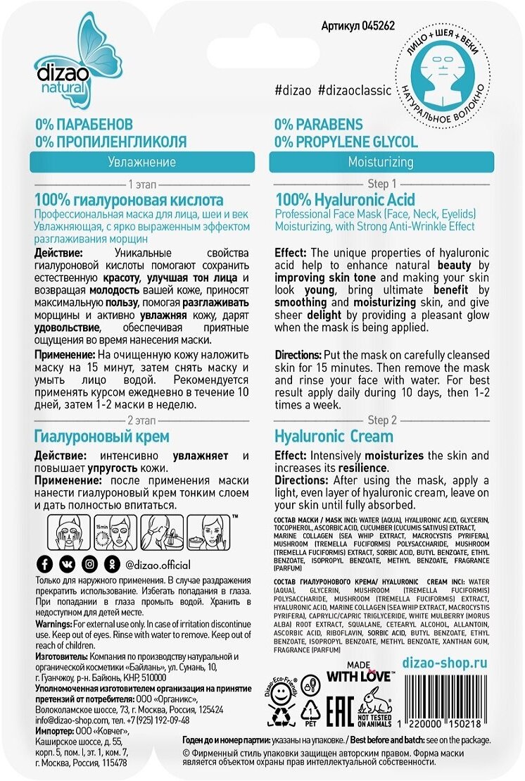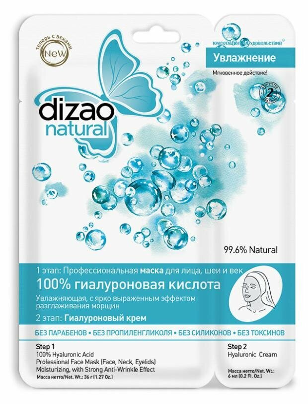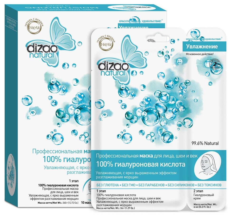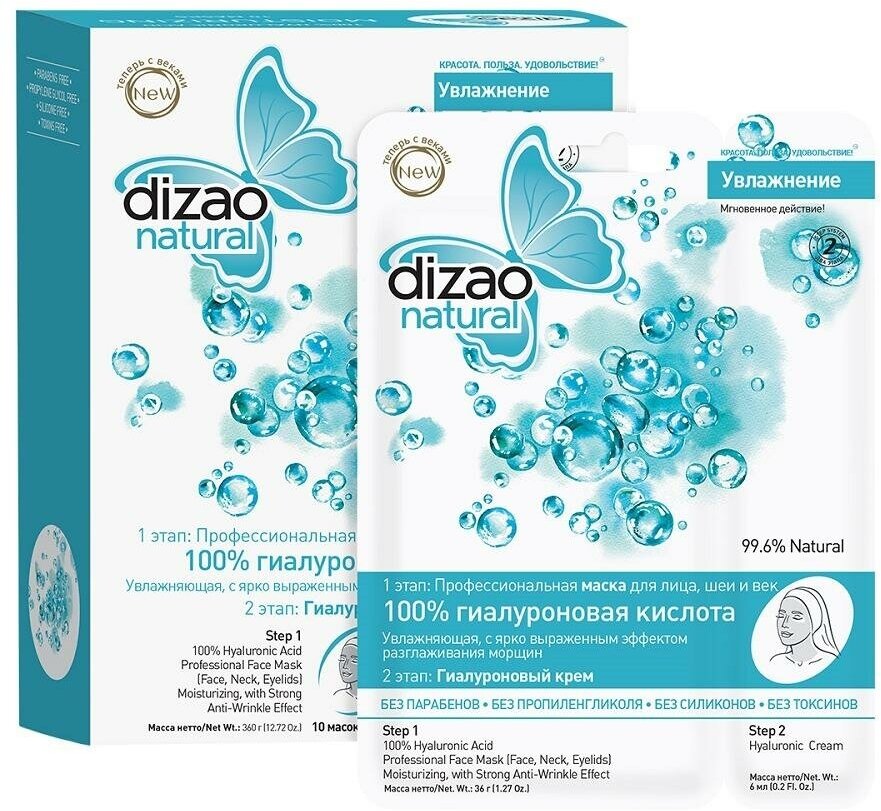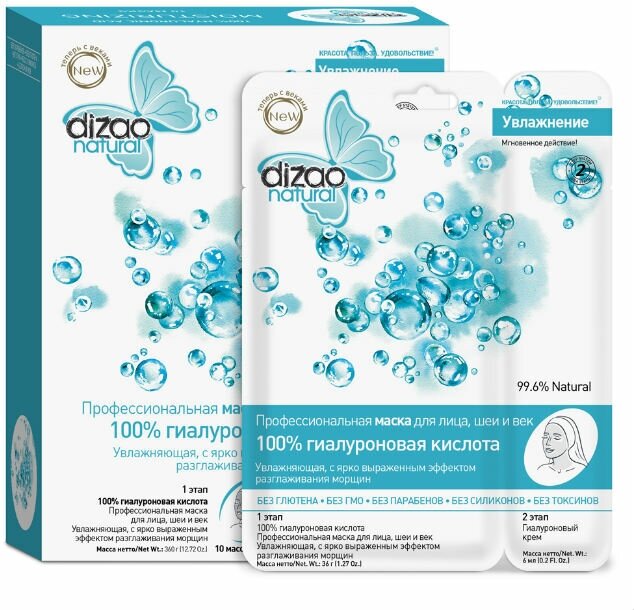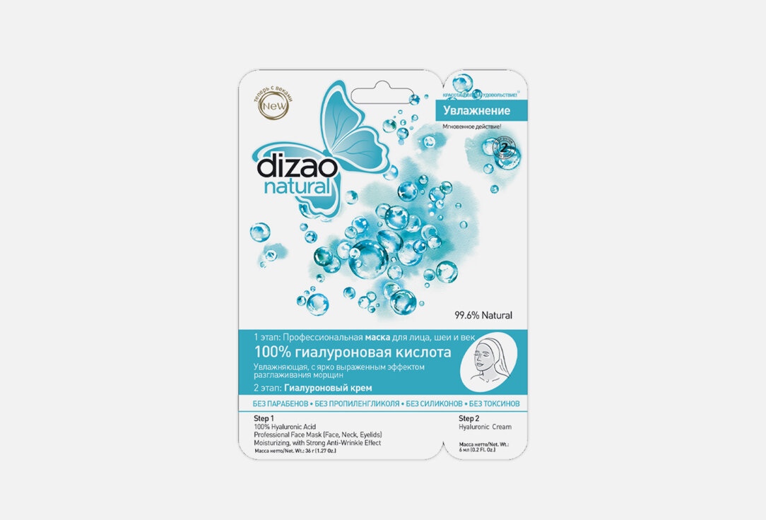 Маска Dizao включает в себя двухэтапный уход за кожей лица, шеи и век. Причина старения кожи состоит в естественном процессе потери влаги в клетках. Гиалуроновая кислота является одним из самых эффективных природных увлажнителей кожи. Маска обладает ярко выраженным эффектом разглаживания морщин, улучшает деление клеток, способствует выработке коллагена и эластина. После применения кожа обретает упругость, эластичность и повышается сопротивляемость к негативным факторам внешней среды. Поддерживает водный баланс и повышает иммунитет. Эффект будет заметен уже после первого применения маски.