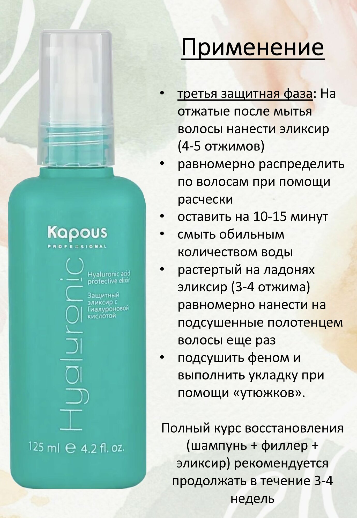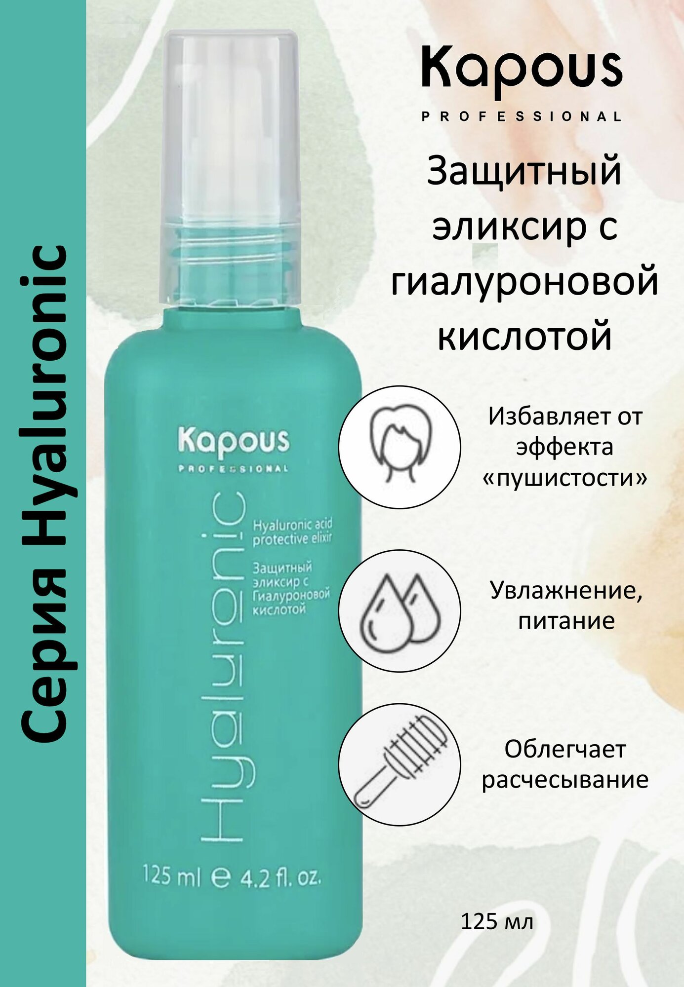 Эликсир с гиалуроновой кислотой предназначен для эффективной защиты волос от негативного воздействия фена, «утюжков», плойки, а также от агрессивных внешних факторов.