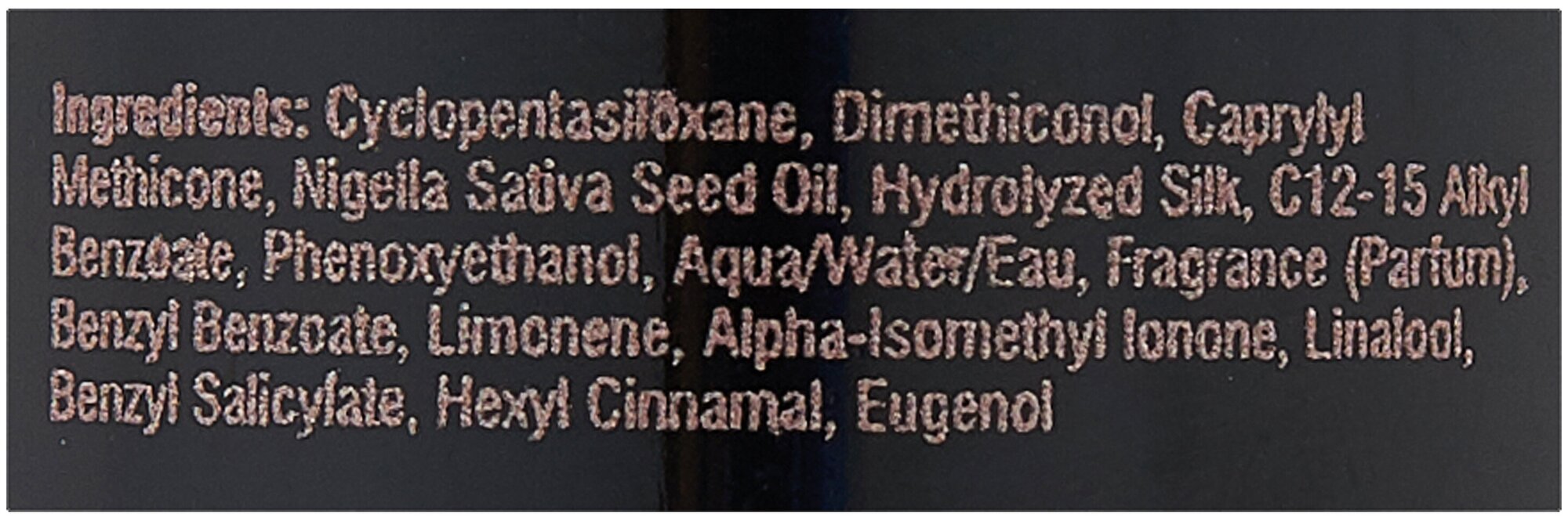 | Состав | Cyclopentasiloxane, Dimethiconol, Caprylyl Methicone, Nigella Sativa Seed Oil, Hydrolyzed Silk, C12-15 Alkyl Benzoate, Phenoxyethanol, Aqua, Fragrance, Benzyl Benzoate, Limonene, Alpha-Isomethyl Ionone, Linalool, Benzyl Salicylate, Hexyl Cinnamal, Eugenol |
