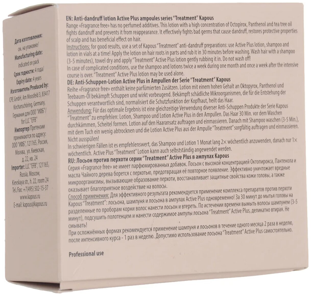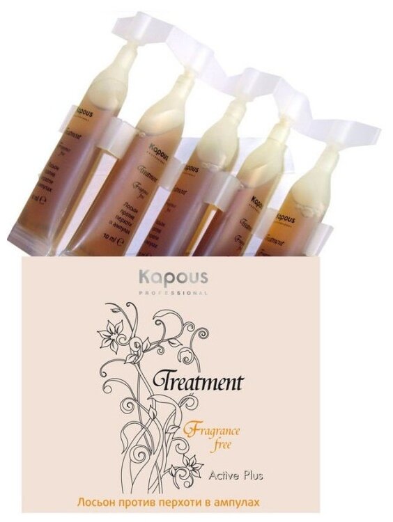 | Применение | предварительно на кожу головы по проборам равномерно нанести лосьон Treatment Active Plus, промассировать и оставить действовать в течении 25-30 минут. Затем вымыть волосы шампунем против перхоти. На вымытые, слегка отжатые волосы равномерно нанести лосьон против перхоти Treatment, кончиками пальцев втирая его в кожу. Лосьон не смывать |