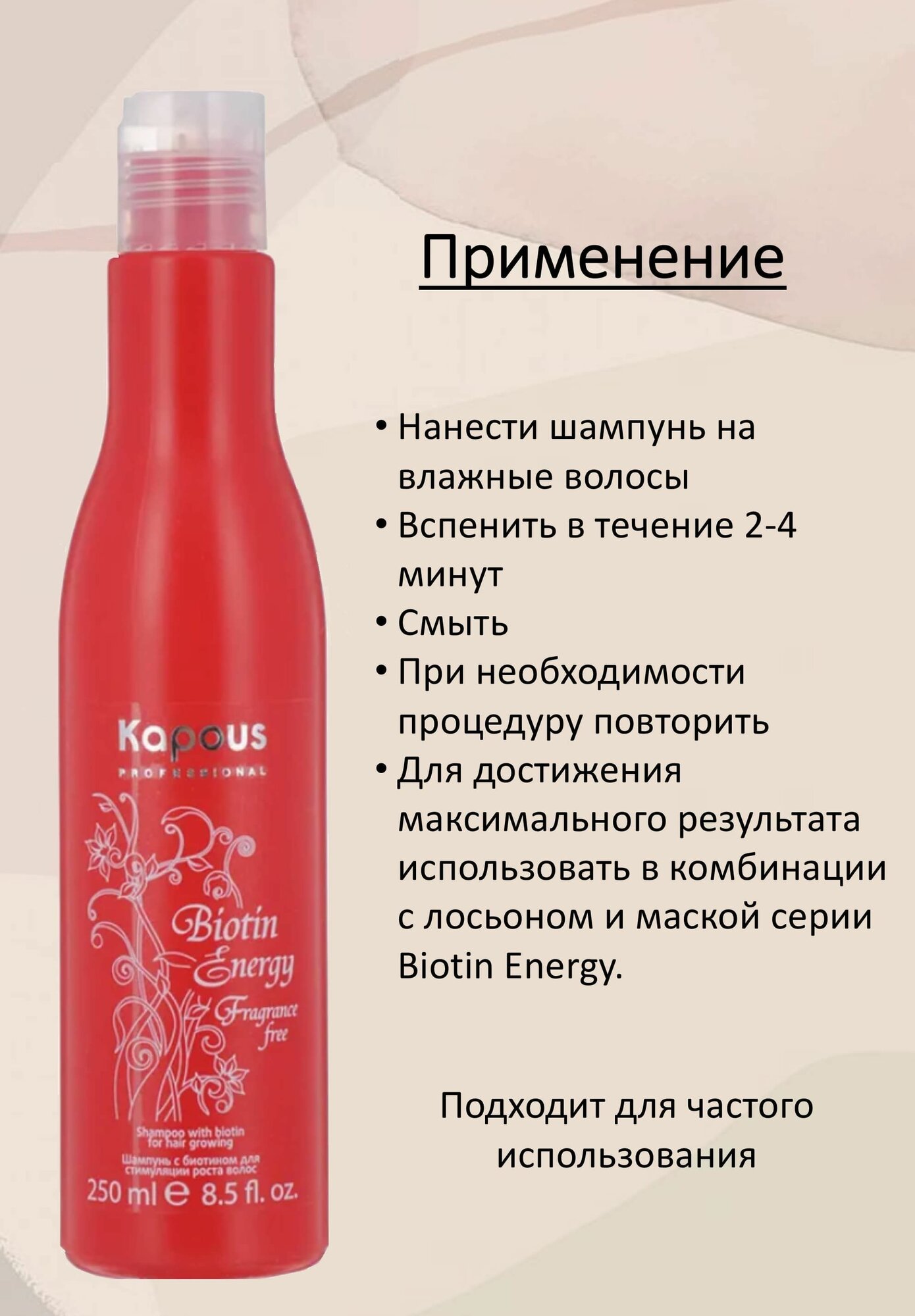 | Применение | нанести небольшое количество шампуня на влажные волосы,вспенить массирующими движениями, распределяя по всей длине волос 2-4 минуты и смыть теплой водой. При необходимости повторить процедуру. Для максимального результата используйте шампунь в комбинации с лосьоном Kapous серии Biotin Energy |
