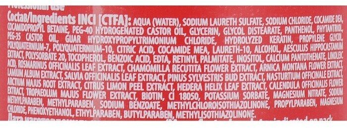 Состав: aqua (water), sodium laureth sulfate, sodium chloride, cocamide dea, cocamidopropyl betaine, peg-40 hydrogenated castor oil, glycerin, glycol distearate, panthenol, phytantriol, peg-35 castor oil, guar hydroxypropyltrimonium chloride, hydrolyzed keratin, propylene glycol, polyquaternium-7, polyquaternium-10, citric acid, cocamide mea, laureth-10, alcohol, aesculus hippocastanum extract, polysorbate 20, tocopherol, benzoic acid, edta, retinyl palmitate, inositol, calcium pantothenate, linoleic acid, rosmarinus officinalis leaf extract, chamomilla recutita flower extract, arnica montana flower extract, lamium album extract, salvia officinalis leaf extract, pinus sylvestris bud extract, nasturtium officinale extract, arctium majus root extract, citrus limon peel extract, hedera helix leaf extract, calendula officinalis flower extract, tropaeolum majus flower extract, biotin, ci 18050, potassium sorbate, magnesium nitrate, sodium methylparaben, methylparaben, sodium benzoate, methylchloroisothiazolinone, propylparaben, magnesium chloride, phenoxyethanol, ethylparaben, butylparaben, methylisothiazolinone