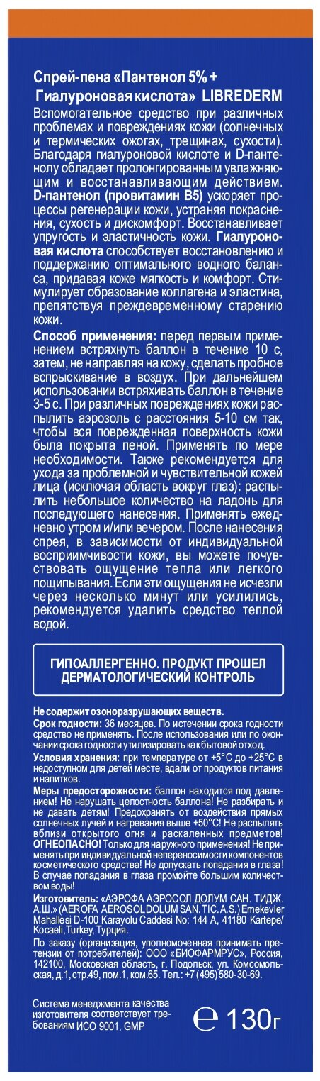 | Способ применения | Перед использованием необходимо тщательно встряхнуть баллон в течение 3-5 с. При различных повреждениях кожи распылить аэрозоль с расстояния 5-10 см так, чтобы вся поврежденная поверхность кожи была покрыта пеной. Применять по мере необходимости. Также рекомендуется для ухода за проблемной и чувствительной кожей лица: распылить небольшое количество на ладонь для последующего нанесения. Применять ежедневно утром и/или вечером. После нанесения спрея, в зависимости от индивидуальной восприимчивости кожи, вы можете почувствовать ощущение тепла или легкого пощипывания. Если эти ощущения не исчезли через несколько минут или усилились, рекомендуется удалить средство теплой водой. |