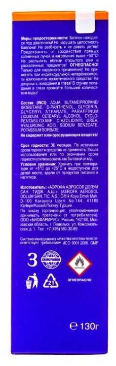 | Состав | aqua, butane/propane/ isobutane, d-panthenol, glycerin, glyceryl stearate, paraffinum liquidum, cetearyl alcohol, cyclopentasiloxane, diazolidinyl urea, hyaluronic acid, sodium benzoate, potassium sorbate |