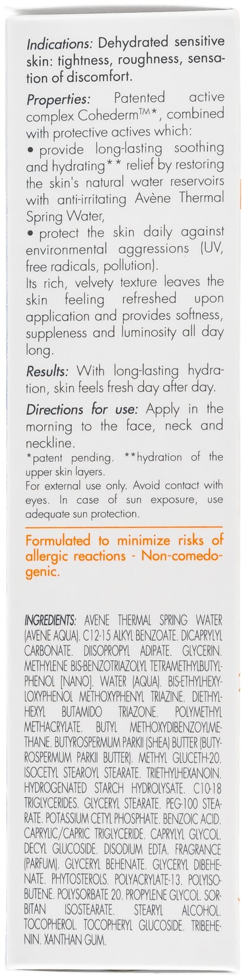 | Состав | avene thermal spring water (avene aqua), c12-15 alkyl benzoate, dicaprylyl carbonate, diisopropyl adipate, glycerin, methylene bis-benzotriazolyl tetramethylbutylphenol [nano], water (aqua), bis-ethylhexyloxyphenol methoxyphenyl triazine, diethylhexyl butamido triazone, polymethyl methacrylate, butyl methoxydibenzoylmethane, butyrospermum parkii (shea) butter (butyrospermum parkii butter), methyl gluceth-20, isocetyl stearoyl stearate, triethylhexanoin, hydrogenated starch hydrolysate, c10-18 triglycerides, glyceryl stearate, peg-10 stearate, potassium cetyl phosphate, benzoic acid, caprylic/capric triglycerides, caprylyl glycol, decyl glucoside, disodium edta, fragrance (parfum), glyceryl behenate, glyceryl dibehenate, phytosterols, polyacrylate-13, polyisobutene, polysorbate-20, propylene glycol, sorbitan isostearate, stearyl alcohol, tocopherol, tocopheryl glucoside, tribehenin, xanthan gum |