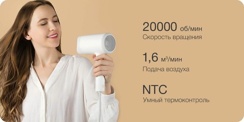 Благодаря ионизации могут быть решены проблемы повреждённых волос, убирается статическое напряжение, что сделает ваши волосы мягкими и эластичными. Технология используется для формирования потока негативно заряженных ионов, который улучшает качество волос и уменьшает потерю волос.Фен оснащен высокоскоростным двигателем с высоким крутящим моментом от японской компании Mabuchi Motor. Вентилятор с шестью лопастями – мощный источник воздушного потока, который подает воздушный объем 1.6м3 за минуту и обеспечивает быструю сушку волос. Все лопасти прошли процесс динамической балансировки. Совмещенные выпрямленные крылья создают меньше шума во время работы, делая сушку намного приятнее.Встроенный NTC модуль чувствует изменение температуры в месте забора воздуха, самостоятельно регулирует время смены подачи горячего воздуха на холодный, тем самым предотвращая повреждение волос от воздействия слишком высокой температуры. Мощность сушки представлена в двух вариантах: сильная и слабая.Фен получил двойную защиту от перегрева. Во-первых, это терморегулирующие элементы, запускающие защиту от отключения питания при превышении температурных показателей. Во-вторых, это плавкий предохранитель, который защищает цепь от короткого замыкания в критический момент. При срабатывании предохранителя, потребуется его замена.Фен выполнен в традиционной стилистике товаров линейки MiHome – белый дизайн в духе минимализма. Он легко впишется в интерьер любой ванной или спальни. Специальная резиновая краска устойчива к загрязнениям: фен всегда будет таким же белым, как в день покупки. Кроме того, она препятствует скольжению и не вредит коже рук.