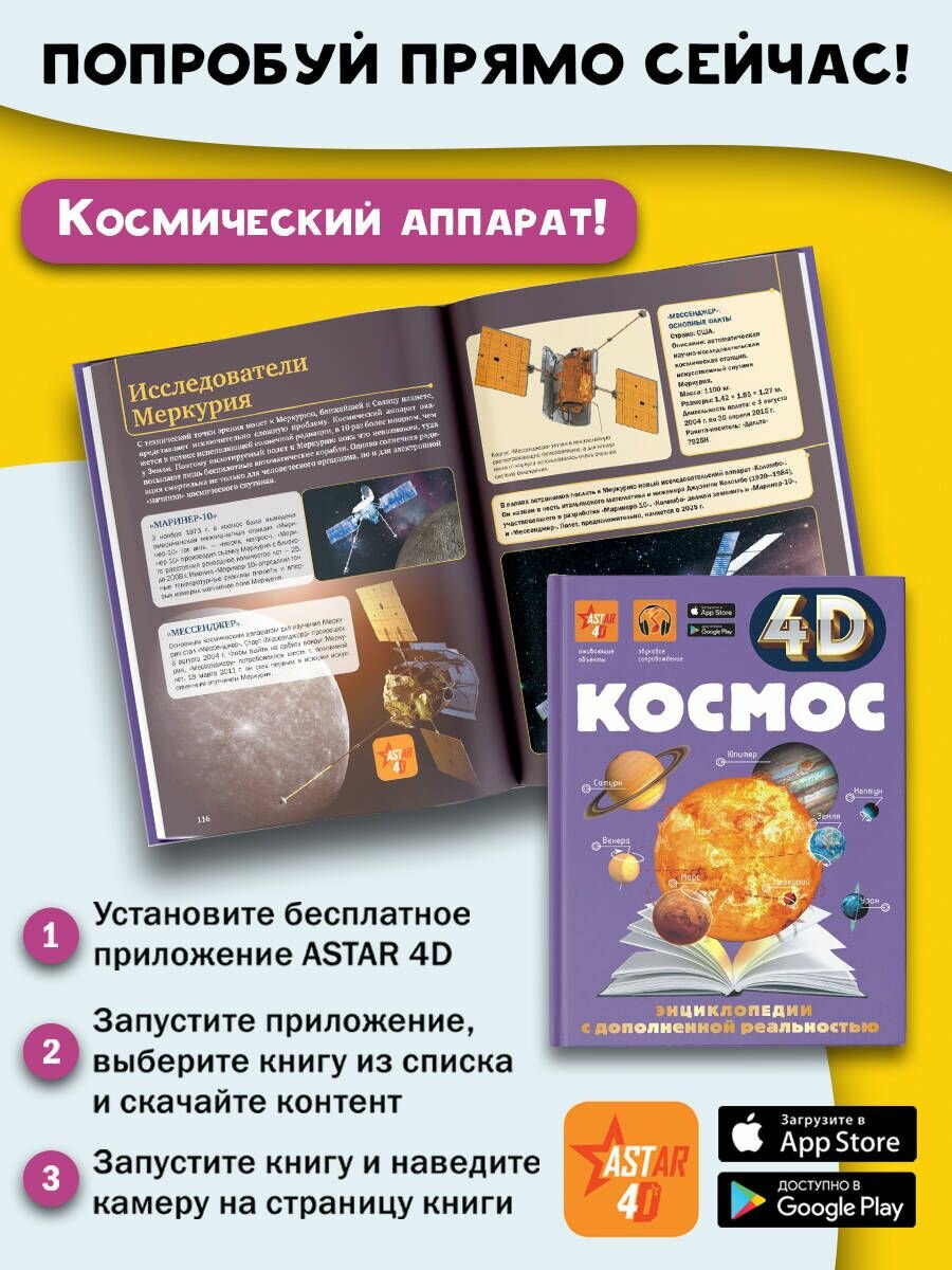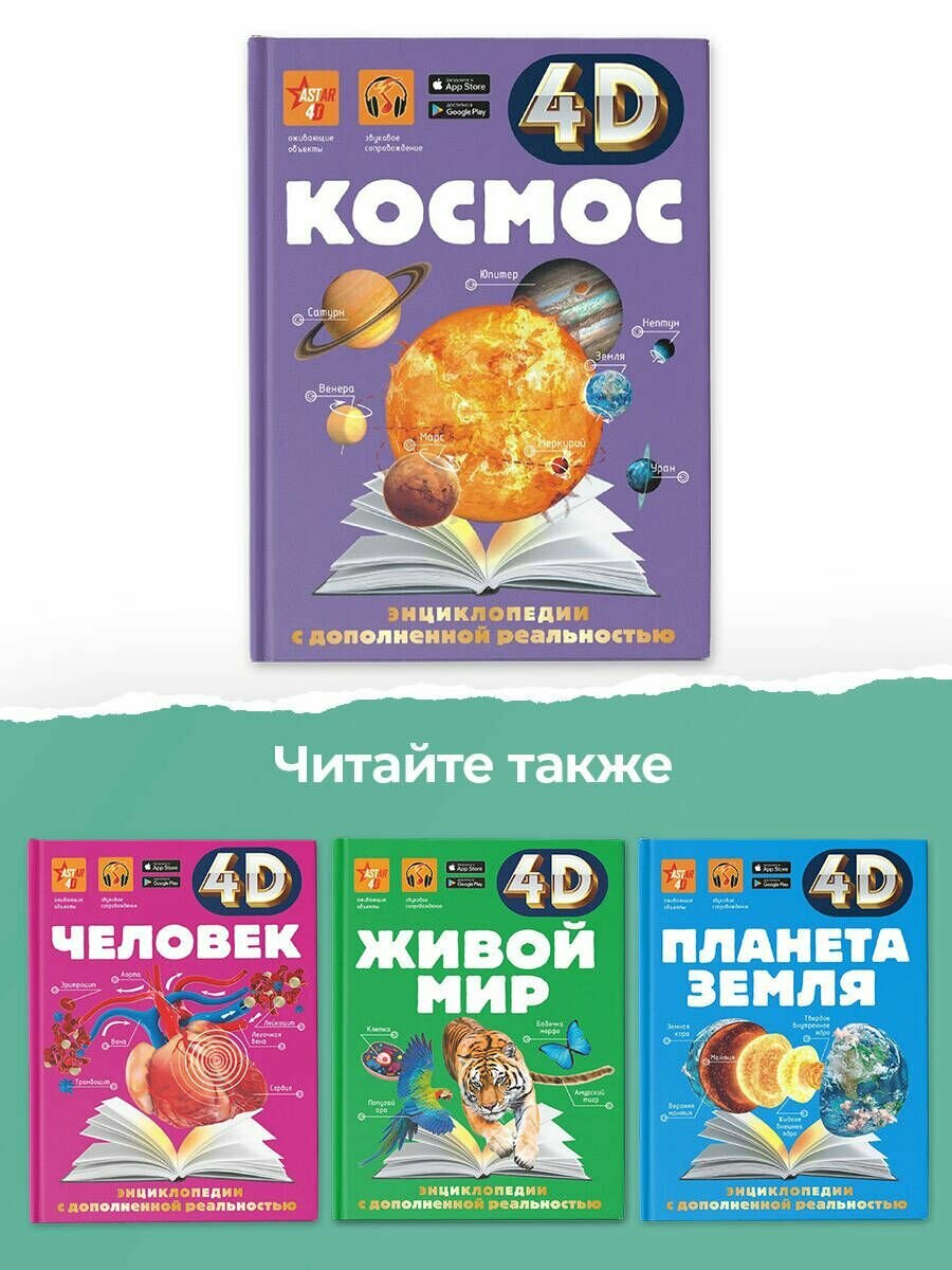 Эта 4D-энциклопедия с дополненной реальностью знакомит читателя с необъятным космосом. Здесь содержится исчерпывающая информация о том, как люди на протяжении тысячелетий стремились к звездам и постепенно познавали недостижимое, но такое манящее небо: строили обсерватории, составляли карты созвездий, изобретали летательные аппараты, запускали в космос человека, высаживались на Луну, выходили в открытое межпланетное космическое пространство... И все это для того, чтобы узнать как можно больше о планетах, Солнце, галактиках, астероидах и множестве других космических объектов. Сегодня вы можете детально и всесторонне изучить каждый из них прямо здесь - на страницах этой 4D-энциклопедии. Открыв для себя мир космоса в объемных "живых" картинках со звуковым сопровождением, вы словно окажетесь на борту космического корабля и воочию поразитесь величию и бесконечности вечного космоса.