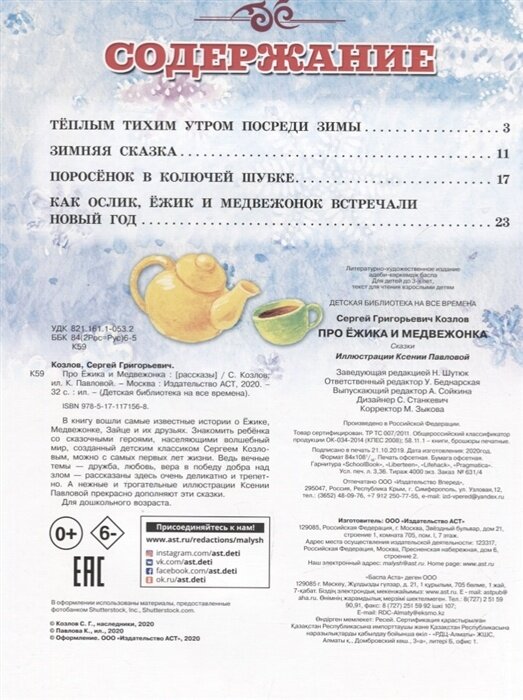 В книгу вошли самые известные истории о Ёжике, Медвежонке, Зайце и их друзьях. Знакомить ребёнка со сказочными героями, населяющими волшебный мир, созданный детским классиком Сергеем Козловым, можно с самых первых лет жизни. Ведь вечные темы - дружба, любовь, вера в победу добра над злом - рассказаны здесь очень деликатно и трепетно. А нежные и трогательные иллюстрации Ксении Павловой прекрасно дополняют эти сказки.