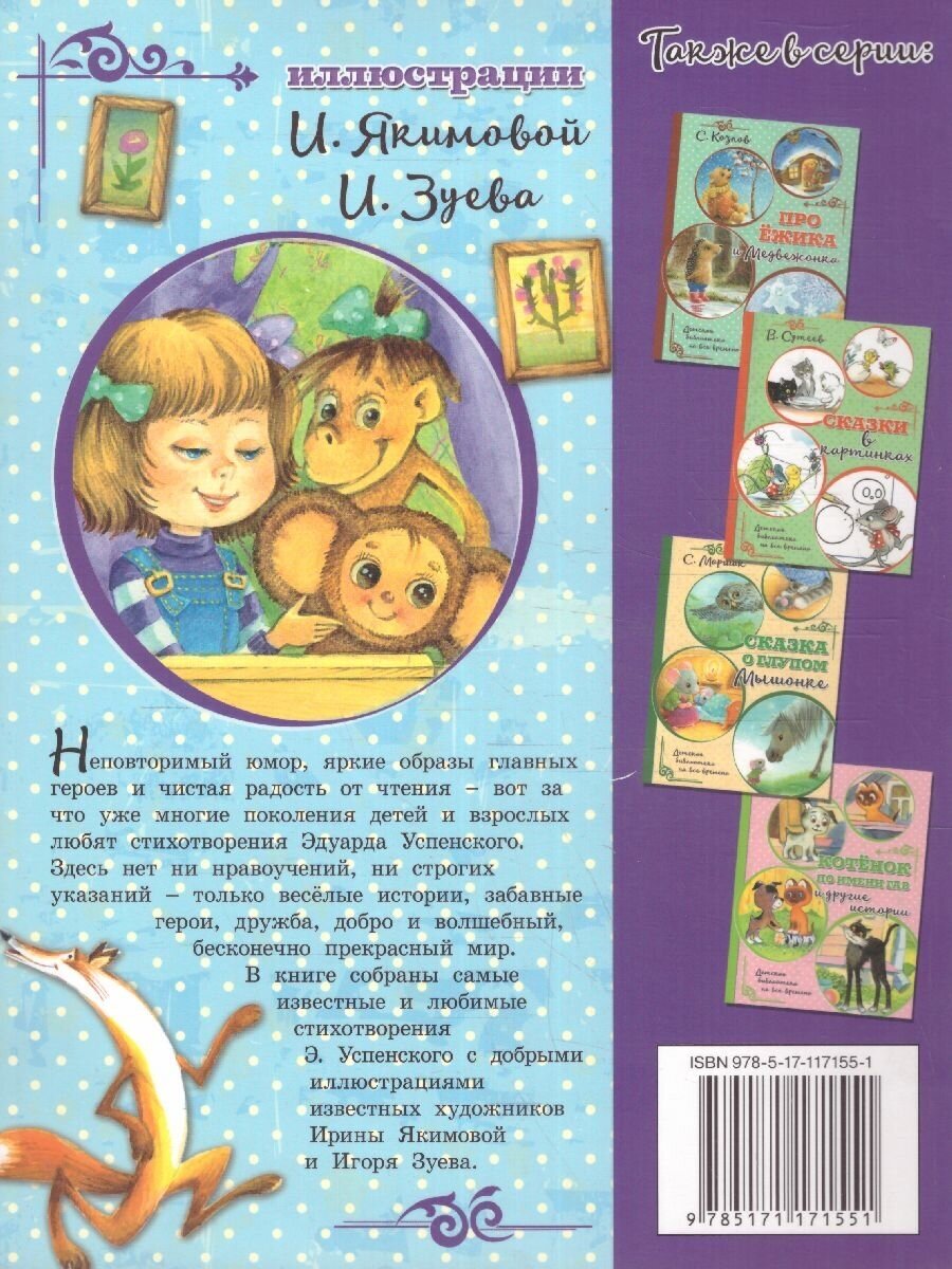 Неповторимый юмор, яркие образы главных героев и чистая радость от чтения - вот за что уже многие поколения детей и взрослых любят стихотворения Эдуарда Успенского. Здесь нет ни нравоучений, ни строгих указаний - только веселые истории, забавные герои, дружба, добро и волшебный, бесконечно прекрасный мир. В книге собраны самые известные и любимые стихотворения Э. Успенского с добрыми иллюстрациями известных художников Ирины Якимовой и Игоря Зуева.