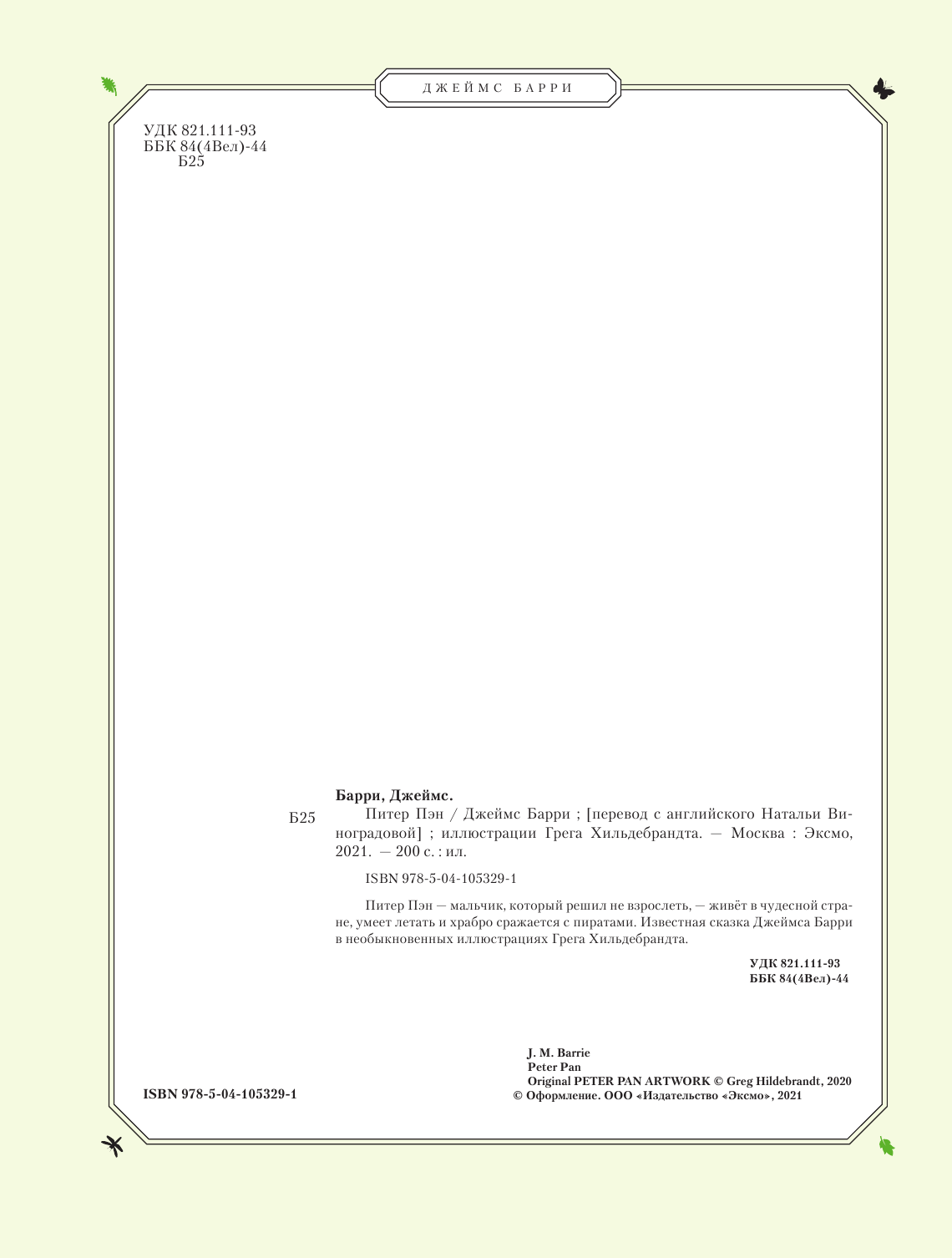 Питер Пэн - мальчик, который решил не взрослеть, - живёт в чудесной стране, умеет летать и храбро сражается с пиратами. Известная сказка Джеймса Барри в необыкновенных иллюстрациях Грега Хильдебрандта.