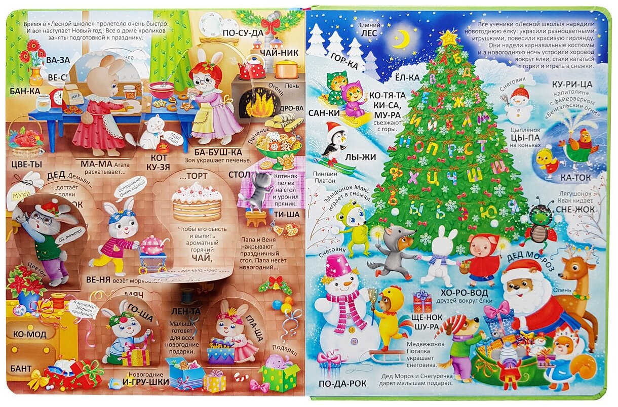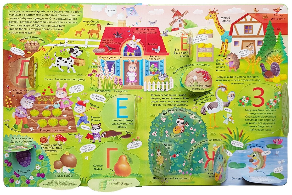.На 8 красочных тематических разворотах (дом, деревня, парк развлечений, город, пляж и другие), посвященных изучению букв и простых слогов, можно долго и с увлечением разглядывать забавные картинки и читать подписи к ним.