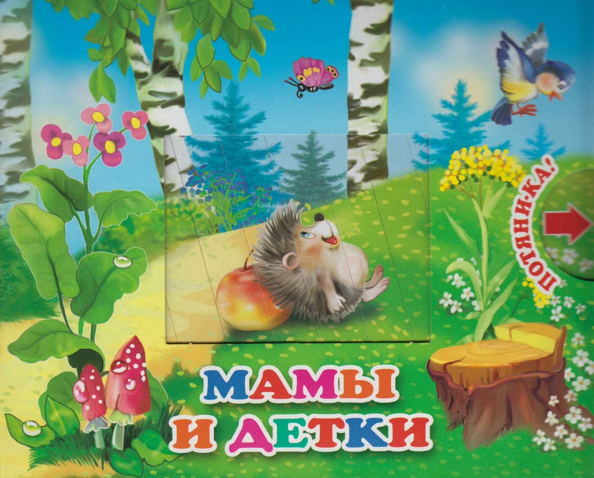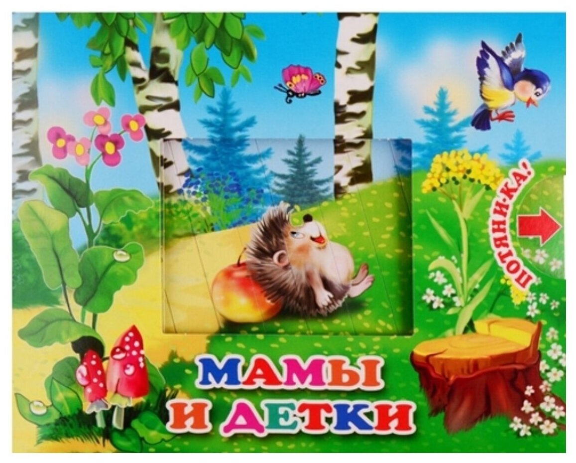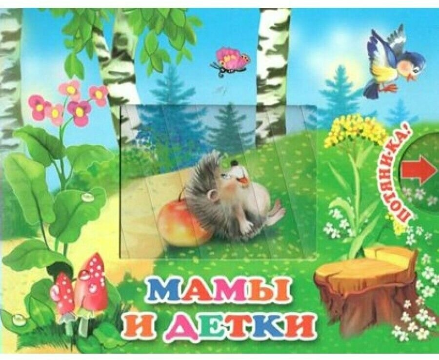 Вашему вниманию предлагается книга серии "Потяни-ка!" "Мамы и детки". При движении шторки в окне меняется картинка.