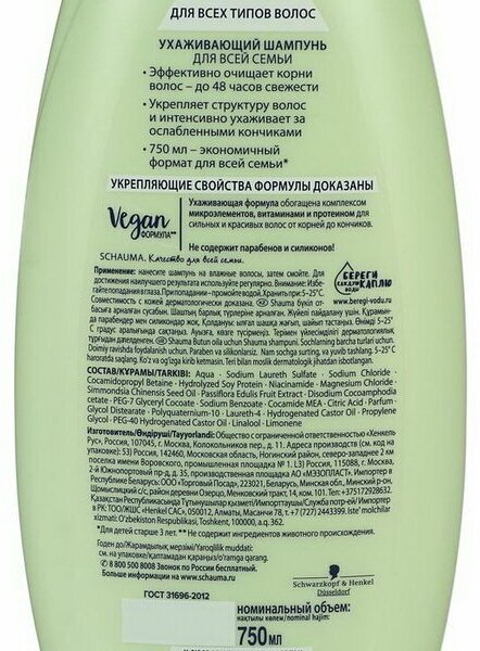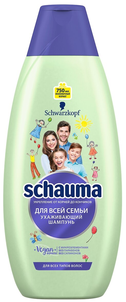 Schauma Шампунь для всей семьи: Эффективно очищает корни волос – до 48 часов свежести. Укрепляет структуру волос и интенсивно ухаживает за ослабленными кончиками. 750 мл – экономичный формат для всей семьи. Ухаживающая формула обогащена комплексом микроэлементов, витаминами и протеином для сильных и красивых волос от корней до кончиков Не содержит парабенов и силиконов!