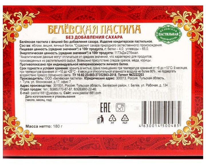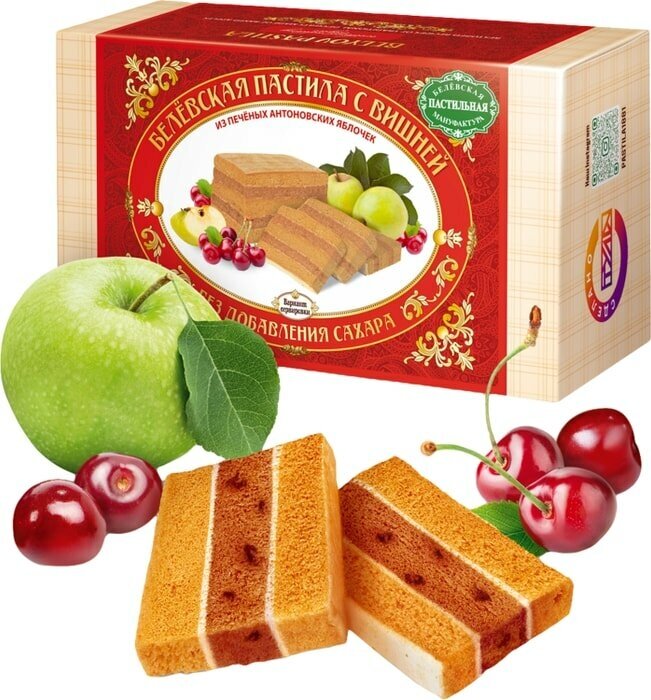 Лакомство представляет собой чередование нежнейших воздушных слоёв традиционной яблочной пастилы с лёгкой антоновской кислинкой и сладких, ароматных ягодных слоёв, которые имеют более выраженный цвет за счёт естественных ягодных красителей, и совершенно другой вкус, гораздо более выраженный и необычный. Это рождает безупречное десертное сочетание, гармонию вкуса спелых антоновских яблок и изысканных ягод.Белёвская ягодная пастила отличается удивительным ярким ароматом и нежнейшей структурой, напоминающей фруктовое облако. Сладость буквально тает во рту и не оставляет равнодушным никого, кто ценит безупречное качество десертов, свежесть и натуральный вкус. Нежный и пышный батончик не только станет хорошей возможностью поднять настроение, но и будет полезен для здоровья сладкоежки: яблочный пектин поможет нормализовать обмен веществ. Можно лакомиться и не думать о фигуре! Состав: яблоки, вишня, яичный белок. Пищевая ценность в 100 г продукта: белки – 4,0 г; углеводы – 65,0 г. Энергетическая ценность: 1173 кДж/276 ккал. Срок годности: при температуре хранения +8 - +10 °C - 9 месяцев,при температуре хранения +10 - +25 °C - 4 месяца(при относительной влажности воздуха не более 75 - 80 %)