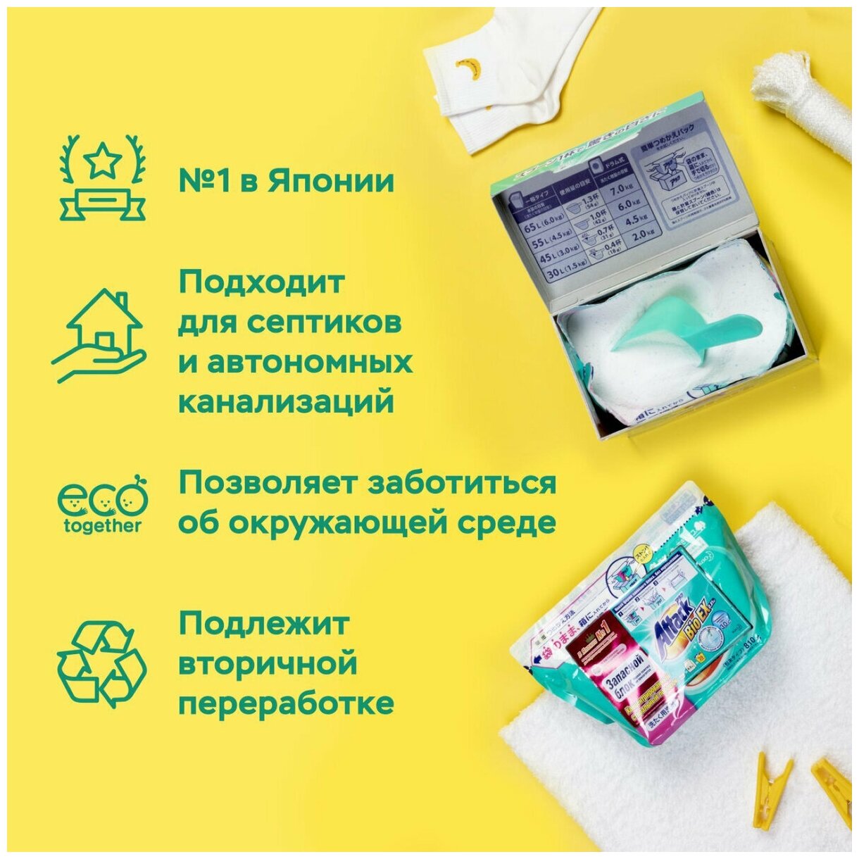 Данное средство впервые в мире признано Международным Авторитетным Советом США по Хлопку в качестве передового моющего средства, удаляющего кожный жир и загрязнения и предотвращающего пожелтение белья.Моментально растворяется в воде. Предназначен стирки изделий из хлопка, льна и синтетических волокон.Содержит высокоактивные биологические ферменты, которые проникают в любой участок лежащего друг на друге белья.За один раз отстирывает большое количество белья, удаляя даже загрязнения и запахи с воротников и манжет.Высокоэффективные биологические ферменты, моментально работая даже в гуще лежащего друг на друге белья, проявляют свой эффект. Они эффективно удаляют даже глубокие загрязнения и запахи с манжет, воротников и носков.В данном порошке усилен компонент предотвращения перемещения загрязнений. Это помогает делать бельё белым и не допускать удалённой грязи вновь задерживаться на ткани.Почему состав легко растворяется даже при большом количестве белья?Воздух, заключённый в микрогранулах при прикосновении их с водой, выходит наружу, поэтому гранулы моментально растворяются. В результате этого концентрированная моющая сила средства легко проникает во все уголки белья. (На упаковке на иллюстрациях показана гранула в разрезе (увеличение в 60 раз), а также пример выхода из гранулы пузырька воздуха).Для стиральных машин с фронтальной загрузкой: - 7 кг белья - 60 г (полная ложка с небольшой горкой) - 6 кг белья - 47 г (полная ложка) - 4,5 кг белья - 34 г (верхняя мерная линия) - 2 кг белья - 20 г (нижняя мерная линия)