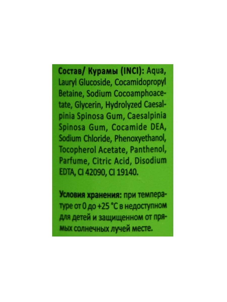 | Состав | Aqua, Lauryl Glucoside, Cocamidopropyl Betaine, Sodium Cocoamphoacetate, Glycerin, Hydrolyzed Caesalpinia Spinosa Gum, Caesalpinia Spinosa Gum, Cocamide DEA, Sodium Chloride, Phenoxyethanol, Tocopherol Acetate, Panthenol, Parfume, Citric Acid, Disodium EDTA, CI 42090, CI 19140 |