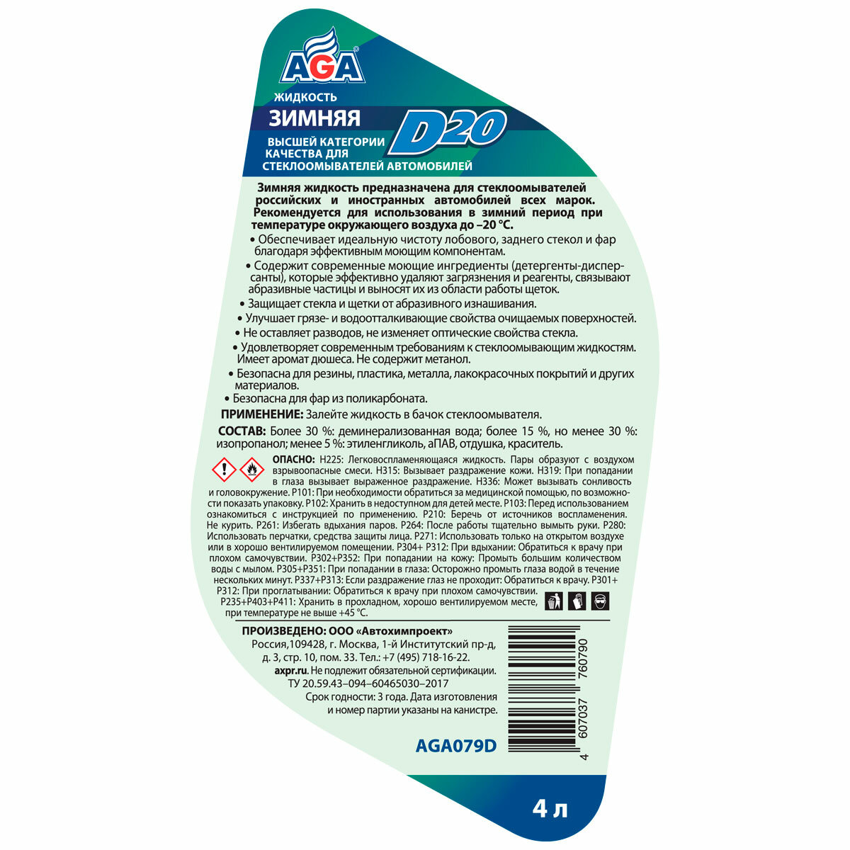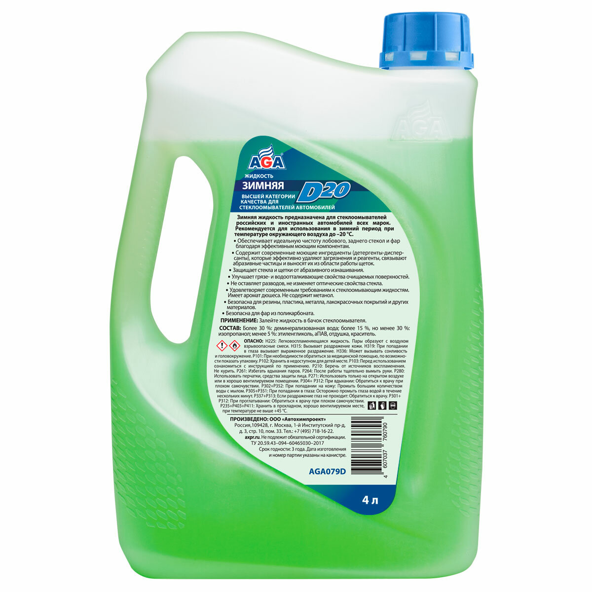 Готовая к применению зимняя стеклоомывающая жидкость AGA-D20 _x000D_ Готовая к применению зимняя стеклоомывающая жидкостьПредназначена для автомобилей всех марок. Температура начала кристаллизации –20 °С. Обладает высокими моющими свойствами, что обеспечивает отличный обзор. Защищает стекло и щетки от абразивного изнашивания. Не оставляет на стекле белесых и маслянистых разводов. Безопасна для лакокрасочного покрытия кузова и материала щеток стеклоочистителя. НЕ СОДЕРЖИТ МЕТАНОЛ!