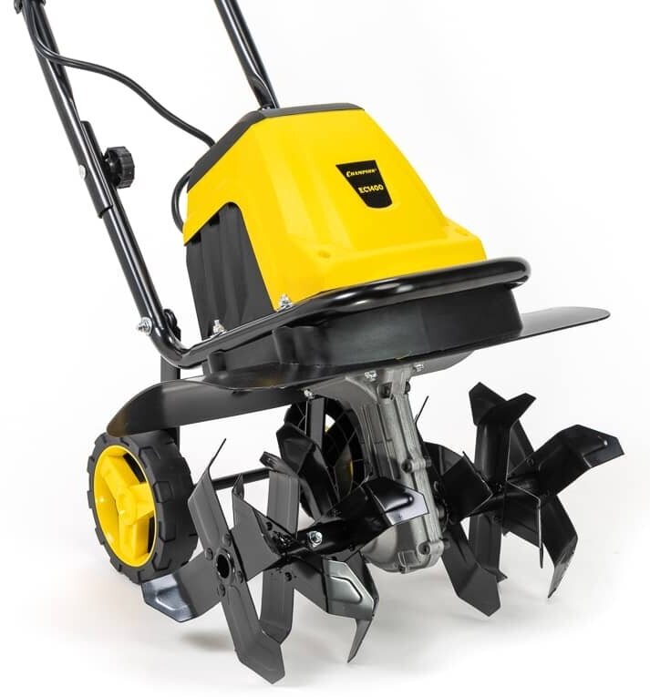 Культиватор электрический Champion – легкий электрический культиватор повышенной мощности. На модели установлен двигатель мощностью 1400 Вт, позволяющий обеспечить достаточный для 6 почвофрез крутящий момент. Двигатель имеет двойную изоляцию медной обмотки и защиту от скачков напряжения в сети и перегрева. В комплект поставки культиватора входят шесть стальных почвофрез, позволяющих производить вспашку на ширину 40 см. При такой значительной мощности и ширине захвата, культиватор весит всего 11 кг.