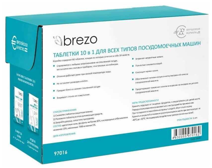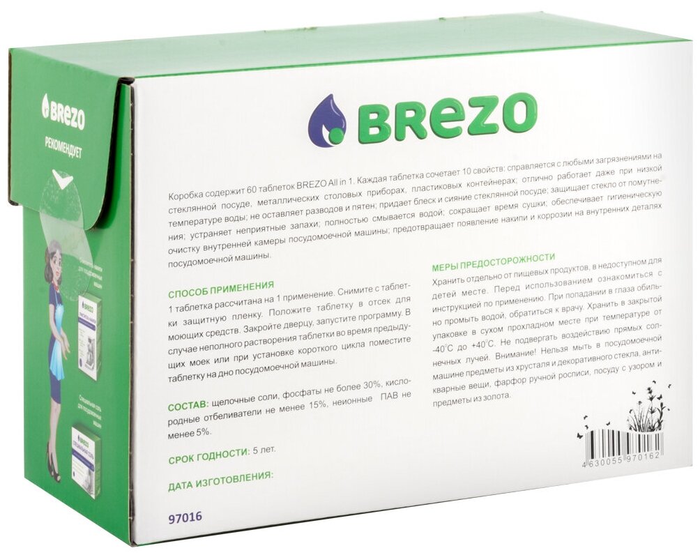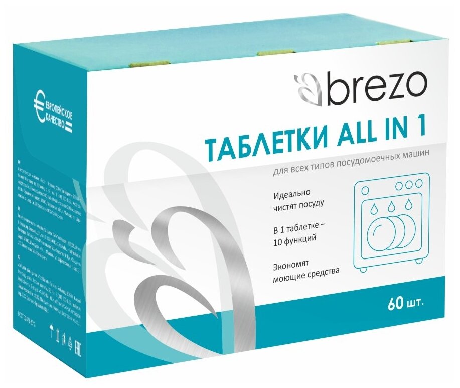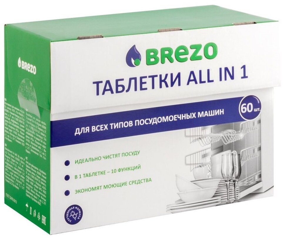 Таблетки ALL IN 1 для посудомоечной машины, 20 шт, бренд: BREZO. Продукция Brezo разработана специально для создания и поддержки чистоты в доме, каждая таблетка сочетает 10 свойств: - справляется с любыми загрязнениями на стеклянной посуде, металлических столовых приборах, пластиковых контейнерах; - отлично работает даже при низкой температуре воды; - не оставляет разводов и пятен; - придает блеск и сияние стеклянной посуде; - устраняет неприятные запахи и полностью смывается водой; - сокращает время сушки; - обеспечивают гигиеническую очистку внутренней камеры посудомоечной машины; - предотвращают появление накипи и коррозии на внутренних деталях посудомоечной машины. Способ применения: Снимите с таблетки защитную пленку. Положите таблетку в отсек для моющих средств. Запустите программу. В случае неполного растворения таблетки во время предыдущих моек или при установке короткого цикла поместите таблетку на дно посудомоечной машины.